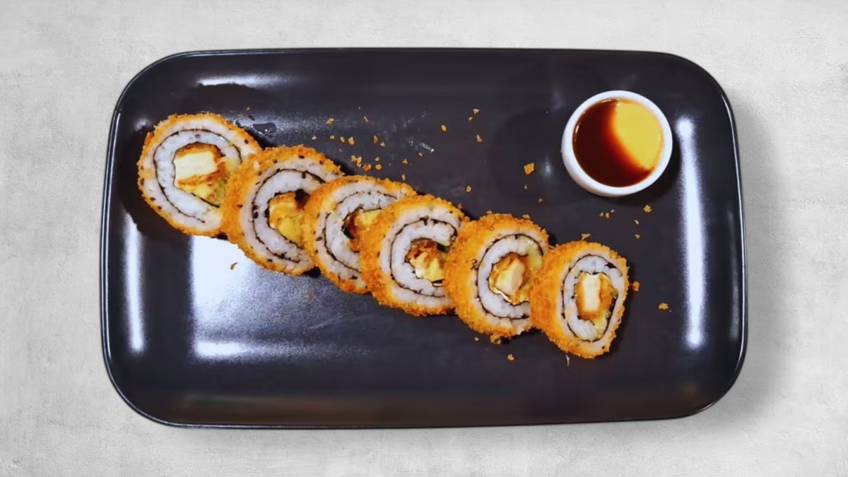 Krabbepinner, masago, sprø panko, agurk, philadelphia og chilimajones. Severes med soya og syltet ingefær.