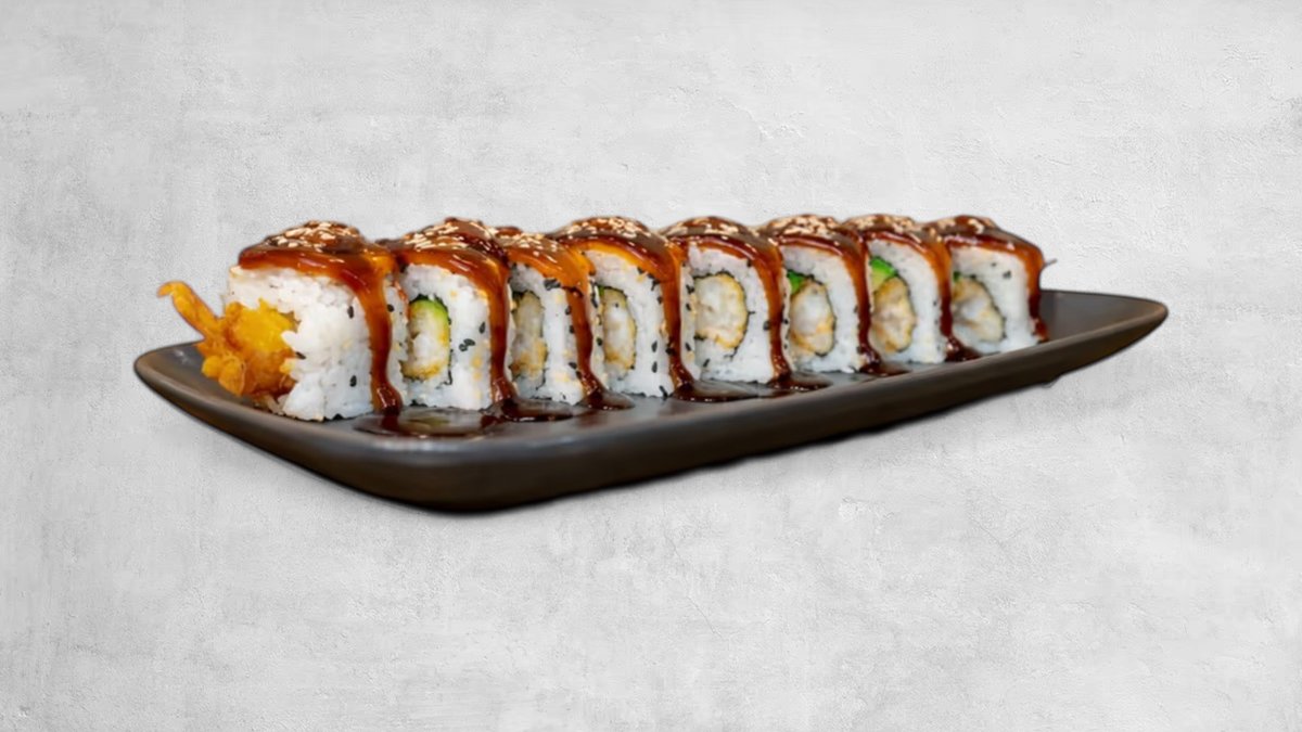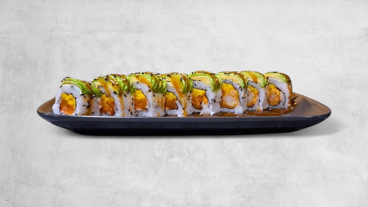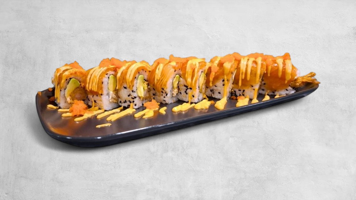 Tempura, laks, avokado, philadelphia, masago og teriyakisaus. Severes med soya og syltet ingefær.