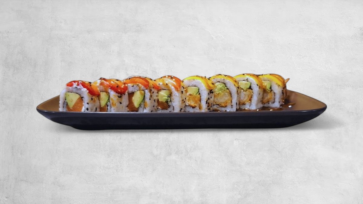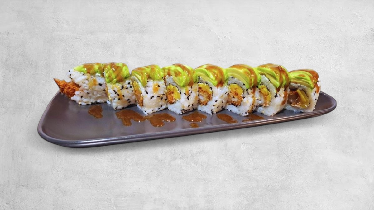 Tempura, avokado, philadelphia, ,mango, sesam og teriyakisaus. Severes med soya og syltet ingefær.