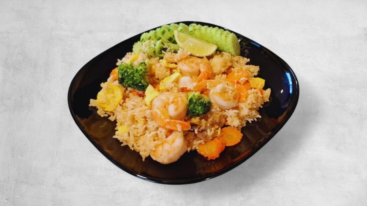 Ris, egg, gulrot og brokkoli. Serveres med agurk og lime.