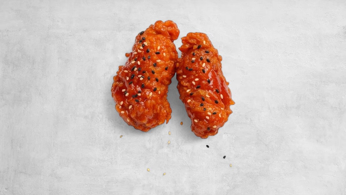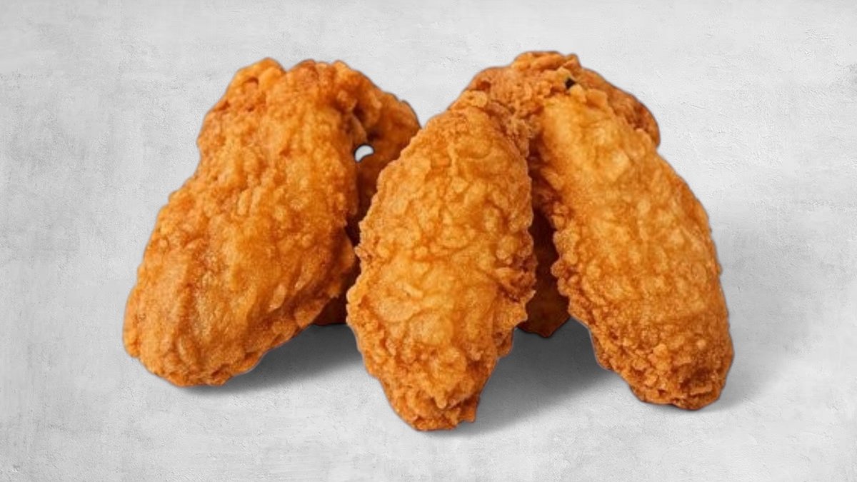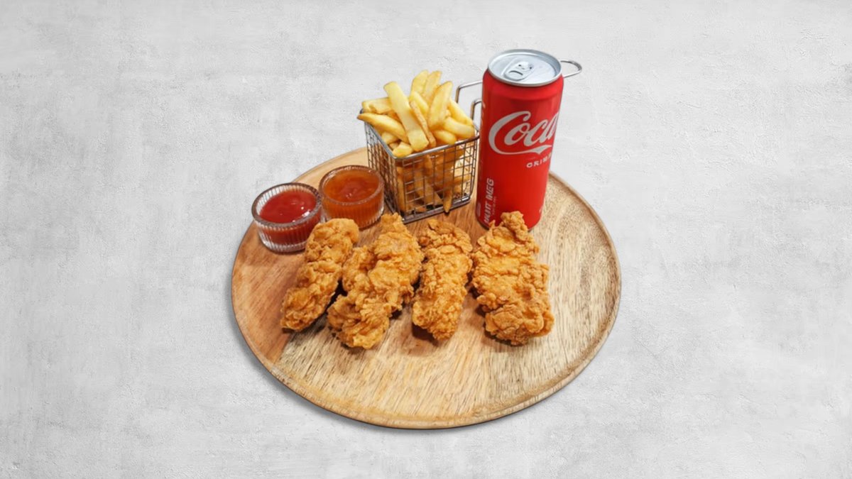 Spicy sprø kylling 4 stk Velg mellom Pommes frites + ketchup eller Ris + Søtchilisaus Burs 0,33l