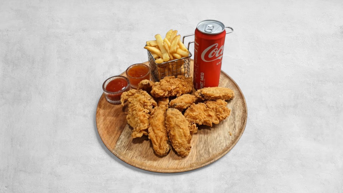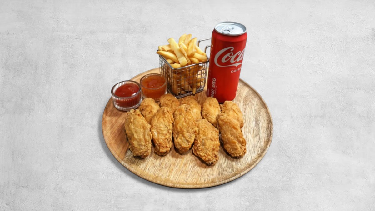 Sprø kyllingvinger 10 stk Velg mellom Pommes frites + ketchup eller Ris + Søtchilisaus Burs 0,33l