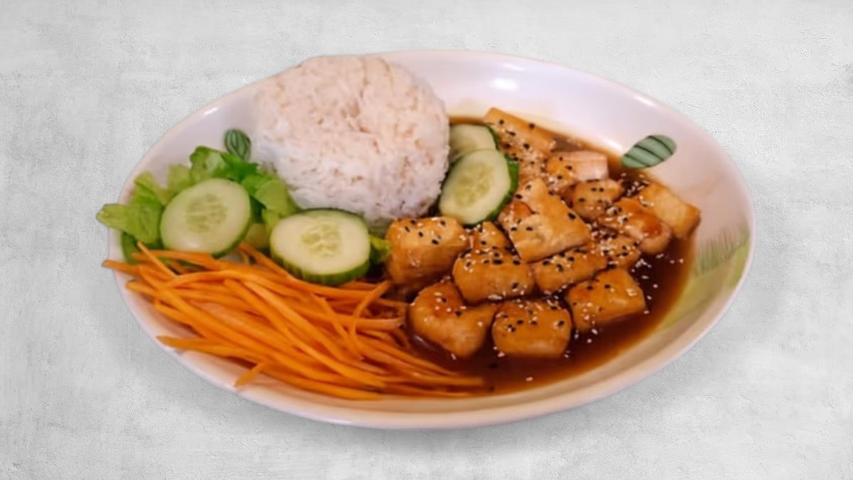 Ris, tofu, gulrot, brokkoli, agurk og lime