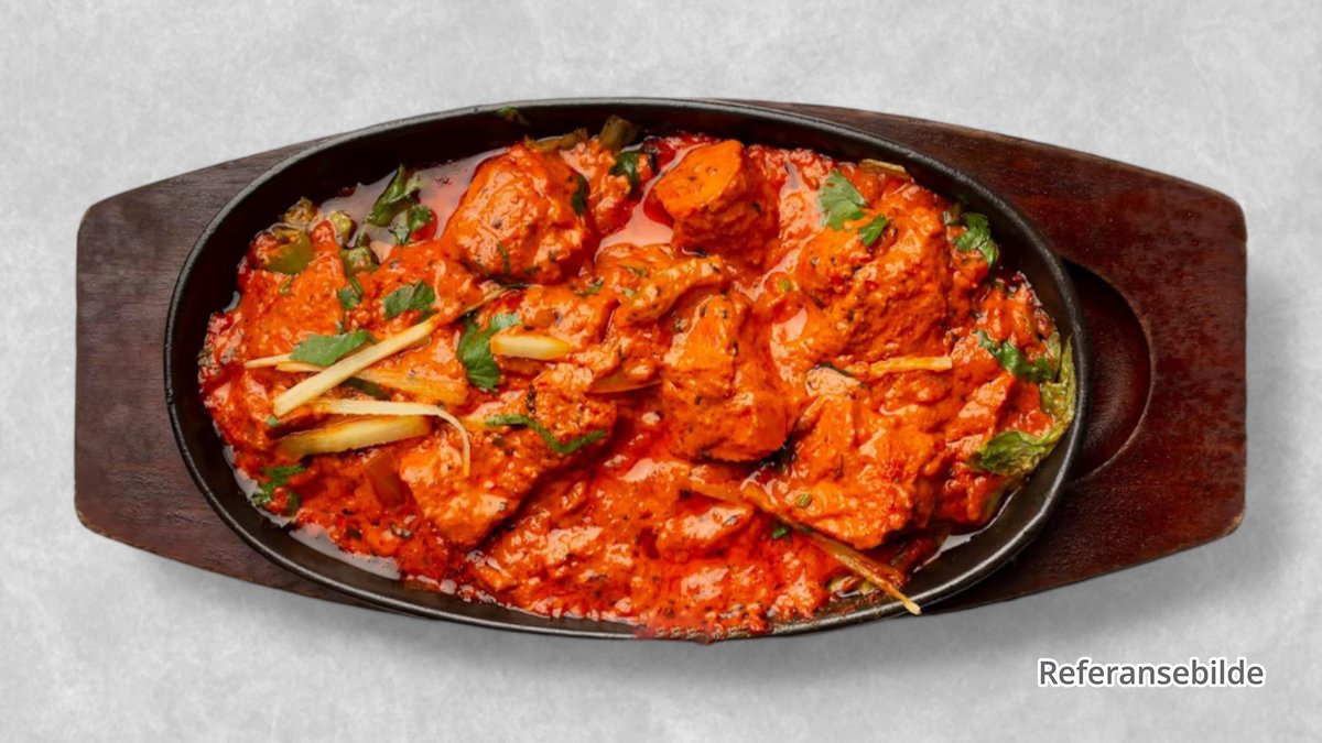 Tandoori røkt kylling tikka. Tilberedt i kremet smør, tomatkarri og koriander.