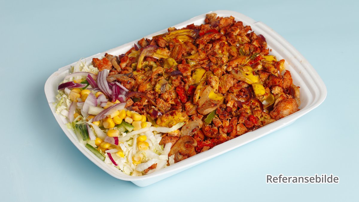 Kylling, paprika, mais, løk, sopp, jalapenos og chilliflak.