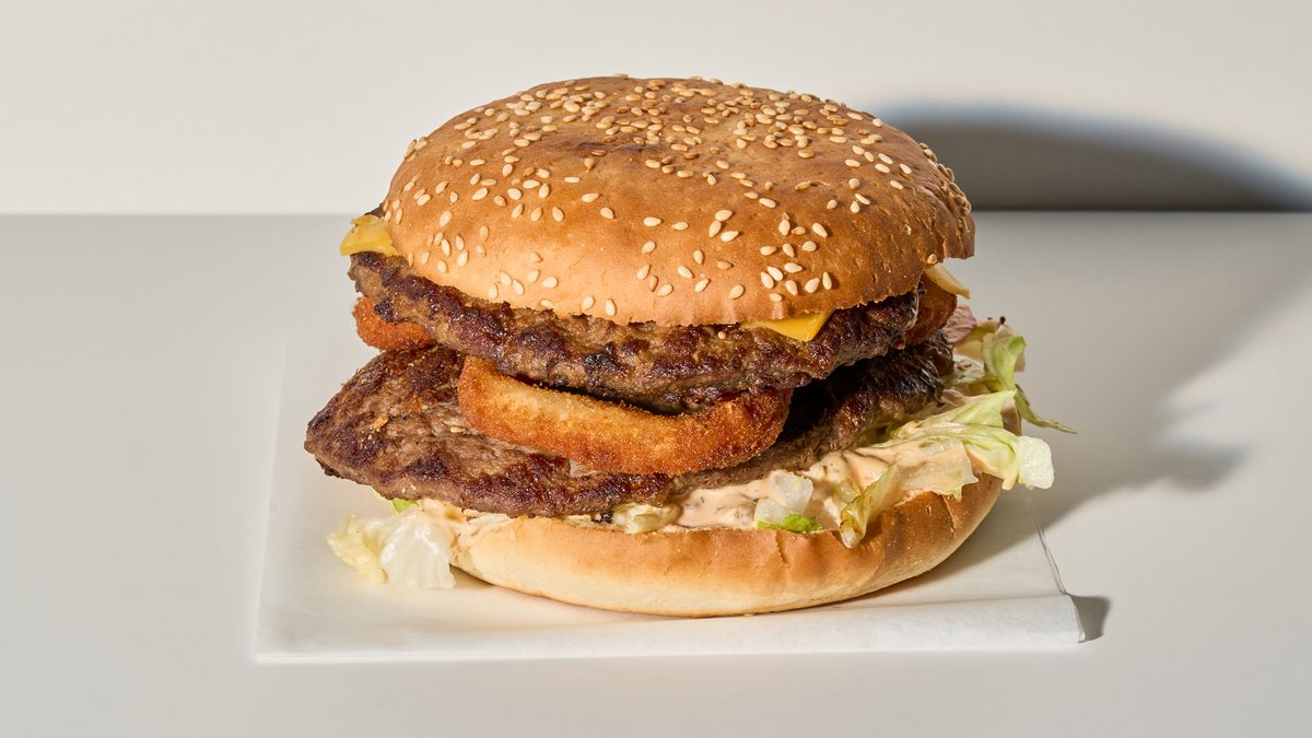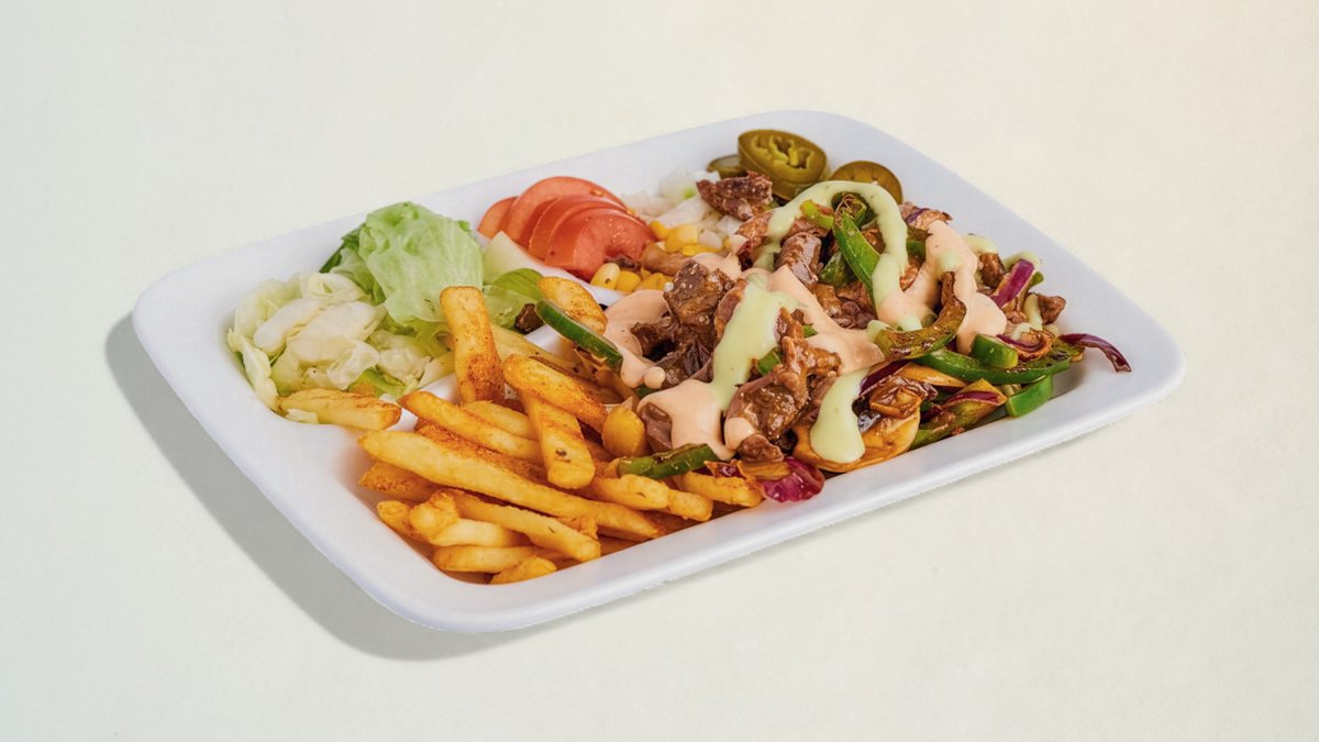 Grillet lavash, grillet kylling eller biff, stekt potet, salte dillagurker, persille-løkblanding, tomatsaus, hvitløksaus.