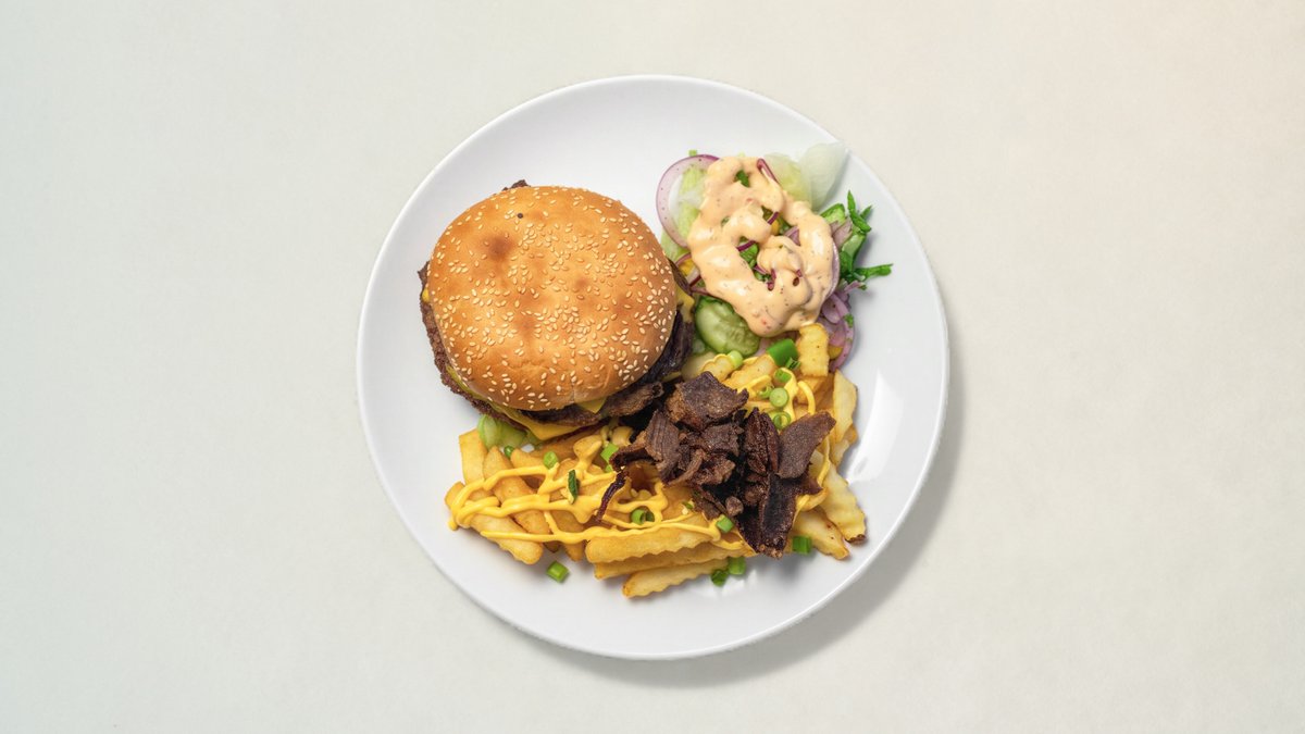 Drammen spicy cheese tallerken med fries + valgfri drikke.
