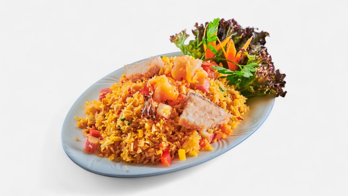 Stekt ris med sterk sjømat.