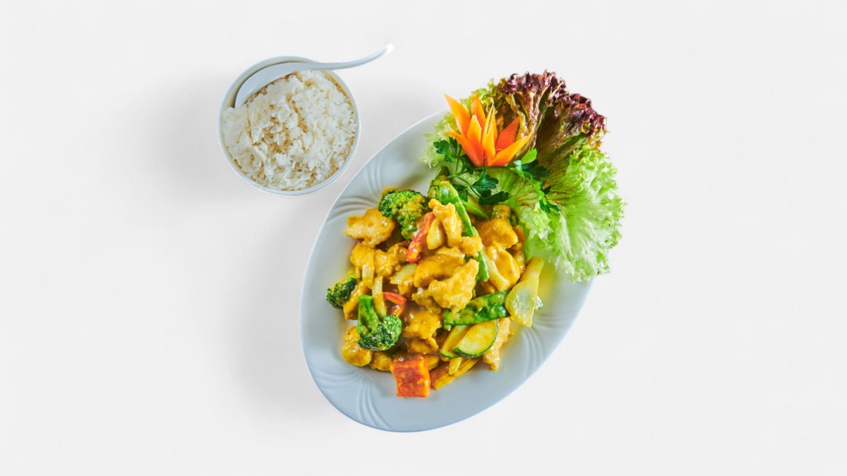 Biff og kylling i kokosmelk, grønn karri, peanøtter, koriander og grønnsaker.