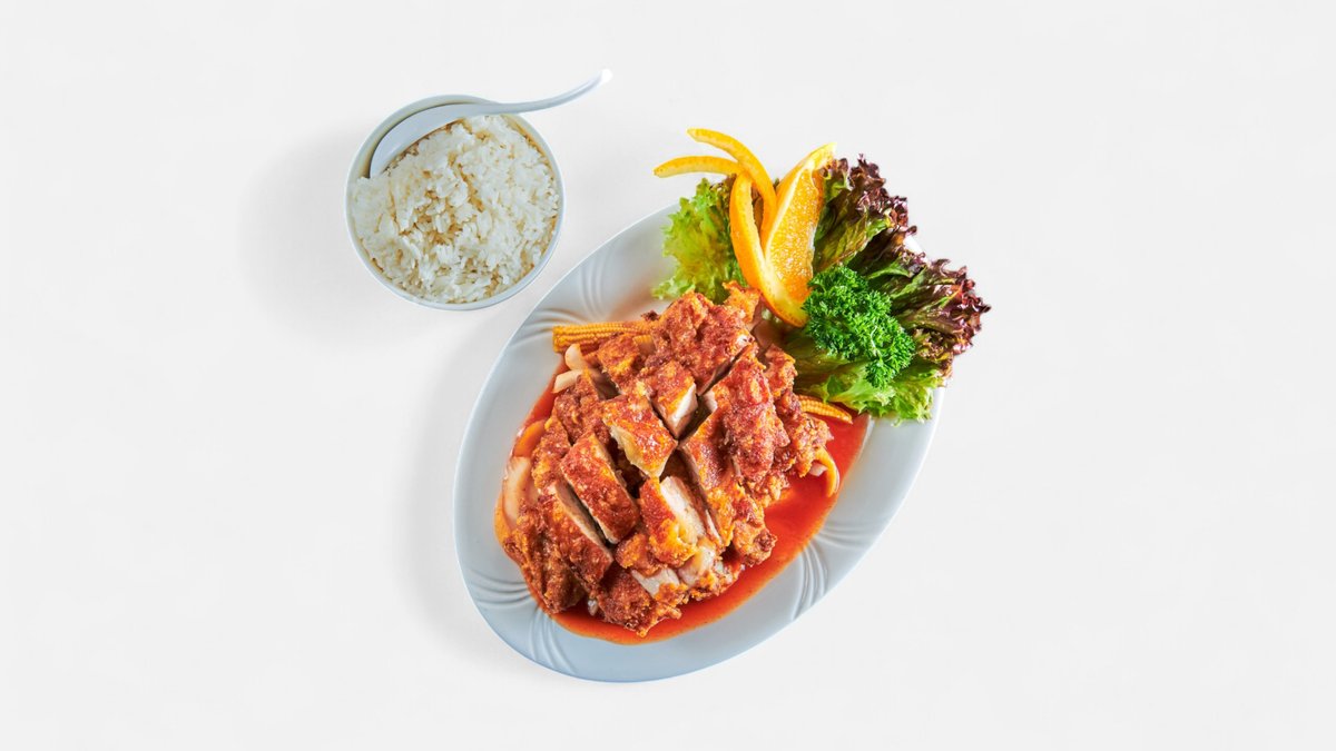 Canton-kylling med ananas og woket grønnsaker i en sursøt saus.