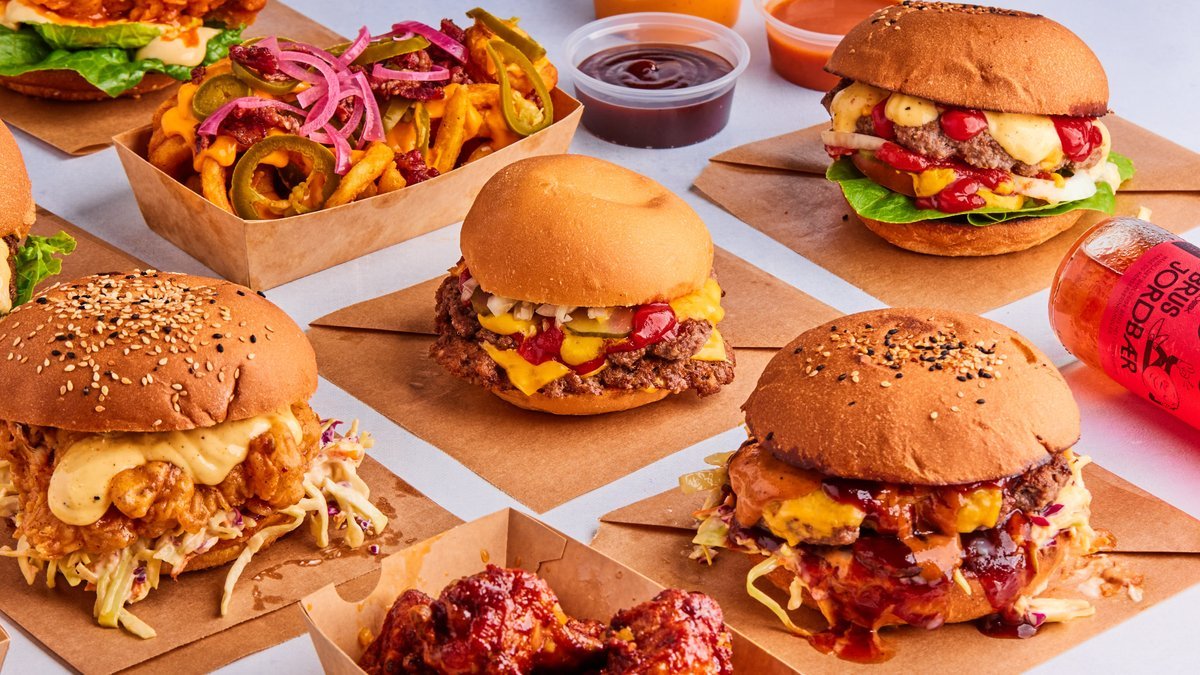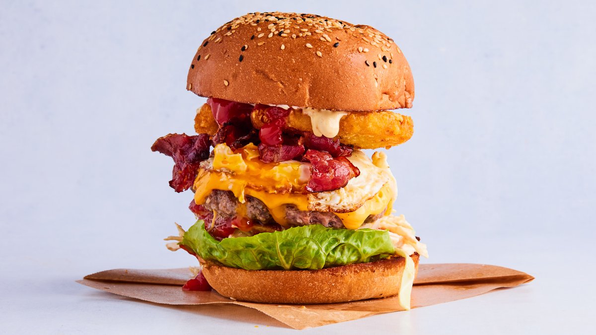 150g biffburger av høyrygg, stekt egg, beef bacon, hash browns, salat, coleslaw, tomat, løk, sylteagurk, cheddarost, ketchup og pepper aioli.