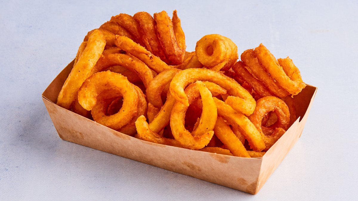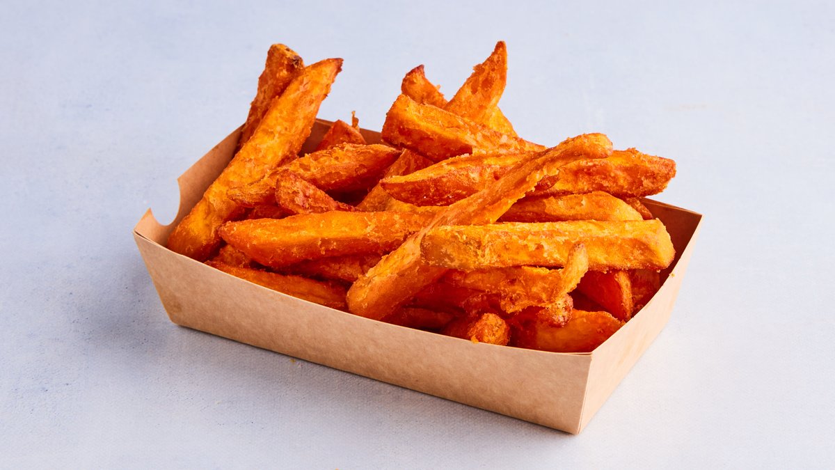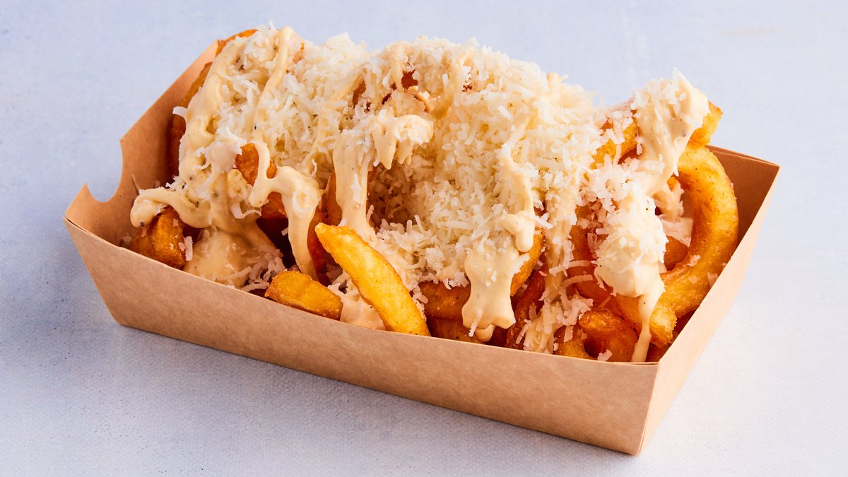 Velg mellom vanlig fries, curly fries eller Søtpotet fries. Toppes med revet parmesan, pepperaioli og vår egen krydderblanding.