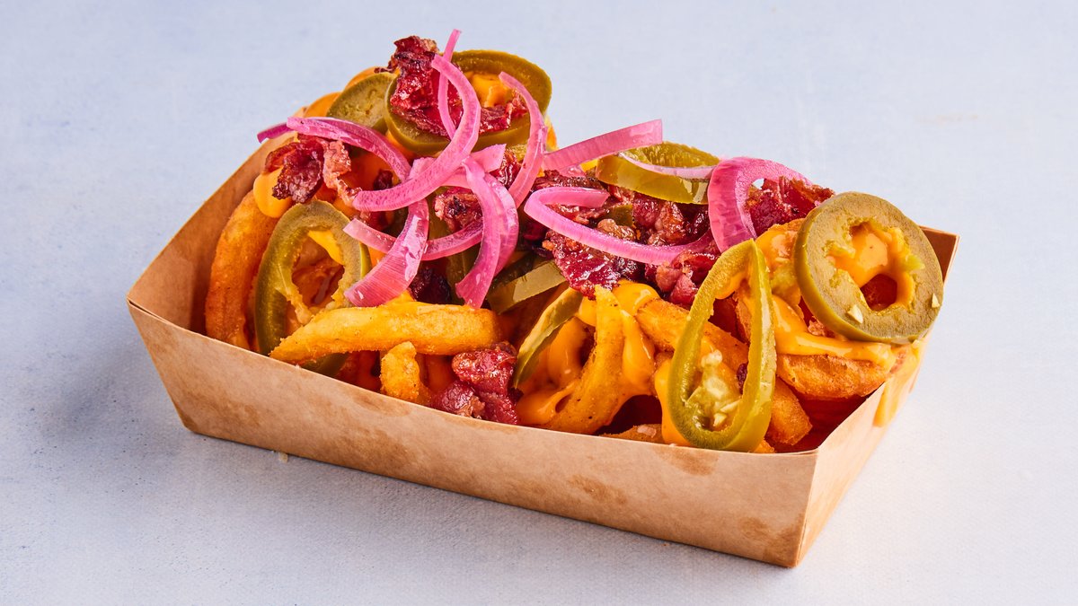 Velg mellom vanlig fries, curly fries eller søtpotet fries. Toppes med beef bacon, cheddar saus, syltet rødløk, jalapenos og vår egen krydderblanding mindre.