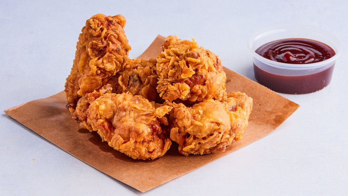 5 stk kyllingvinger, 1 stk lårfilèt, fries og coleslaw.
