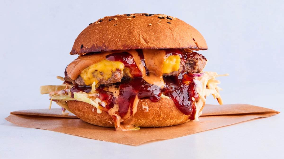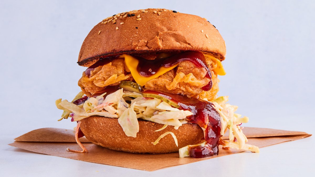 BBQ Quorn filet burger med coleslaw, sylteagurk, cheddarost, signature dressing og BBQ saus.