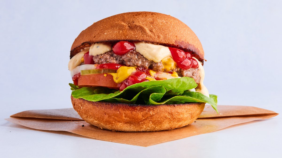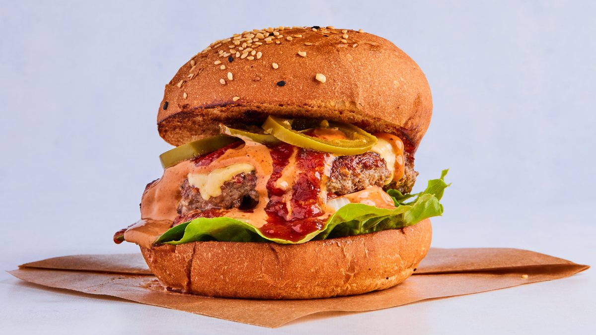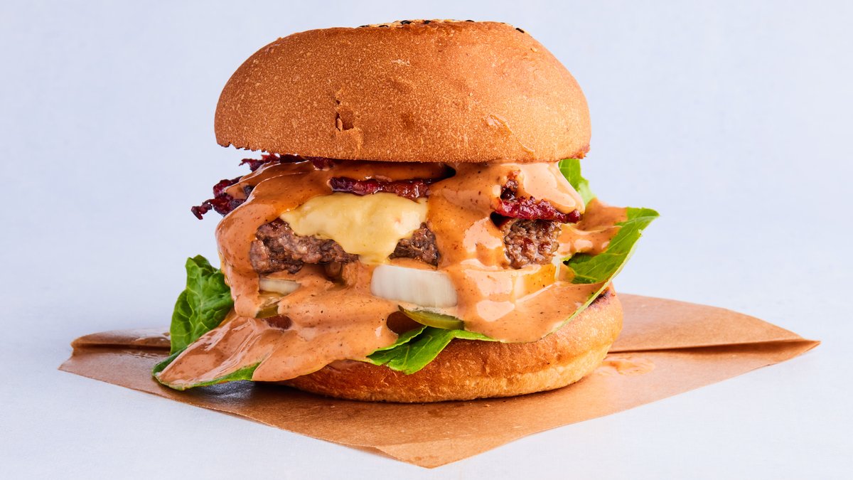150g biffburger av høyrygg, beef bacon, salat, tomat, løk, sylteagurk, pepper jack ost og signature dressing.