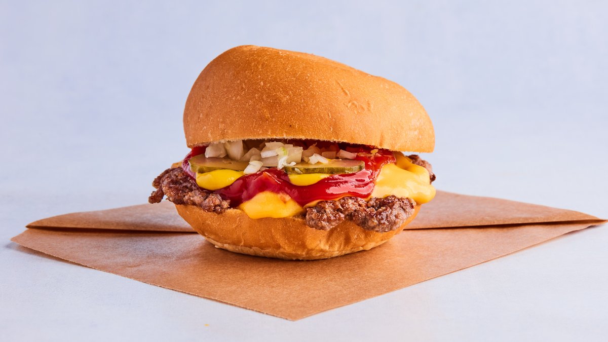 70g biffburger av høyrygg, løk, sylteagurk, cheddar ost, ketchup og sennep.