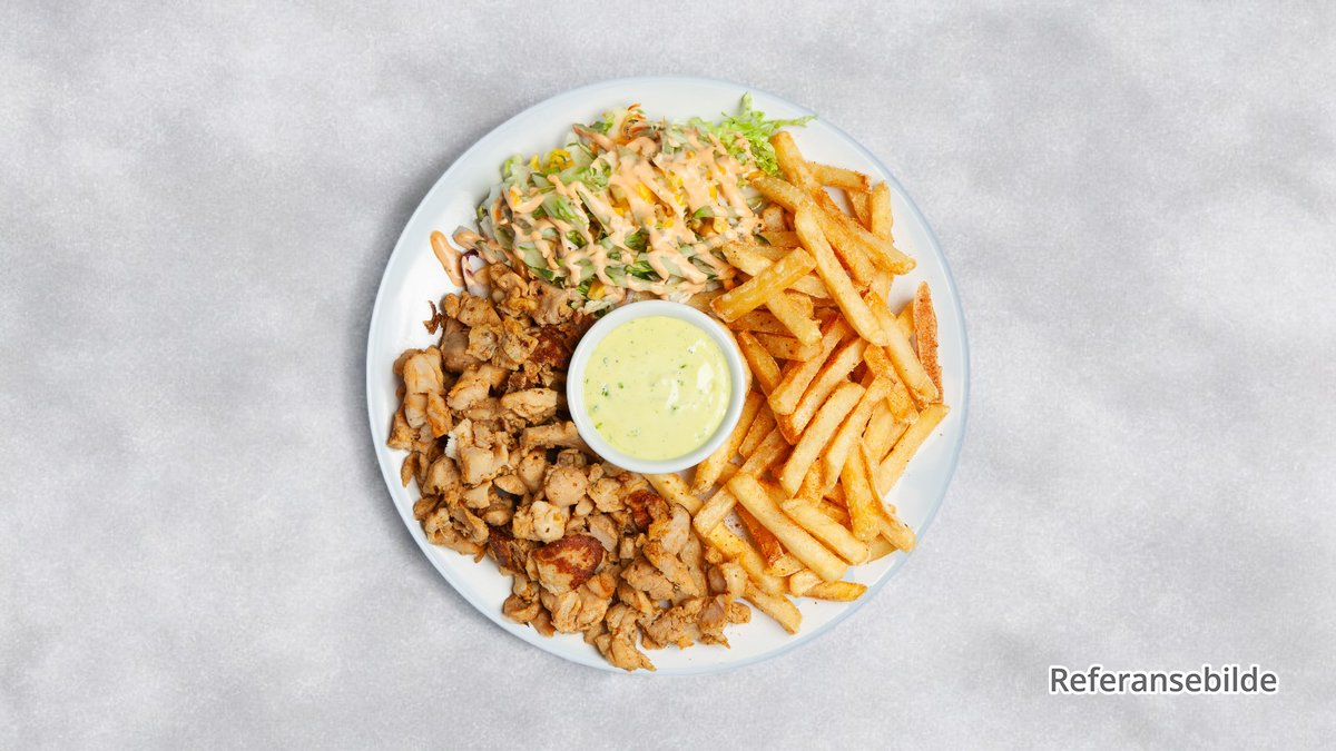 Kebabtellerken. Serveres med pommes frites, salat og dressing.
