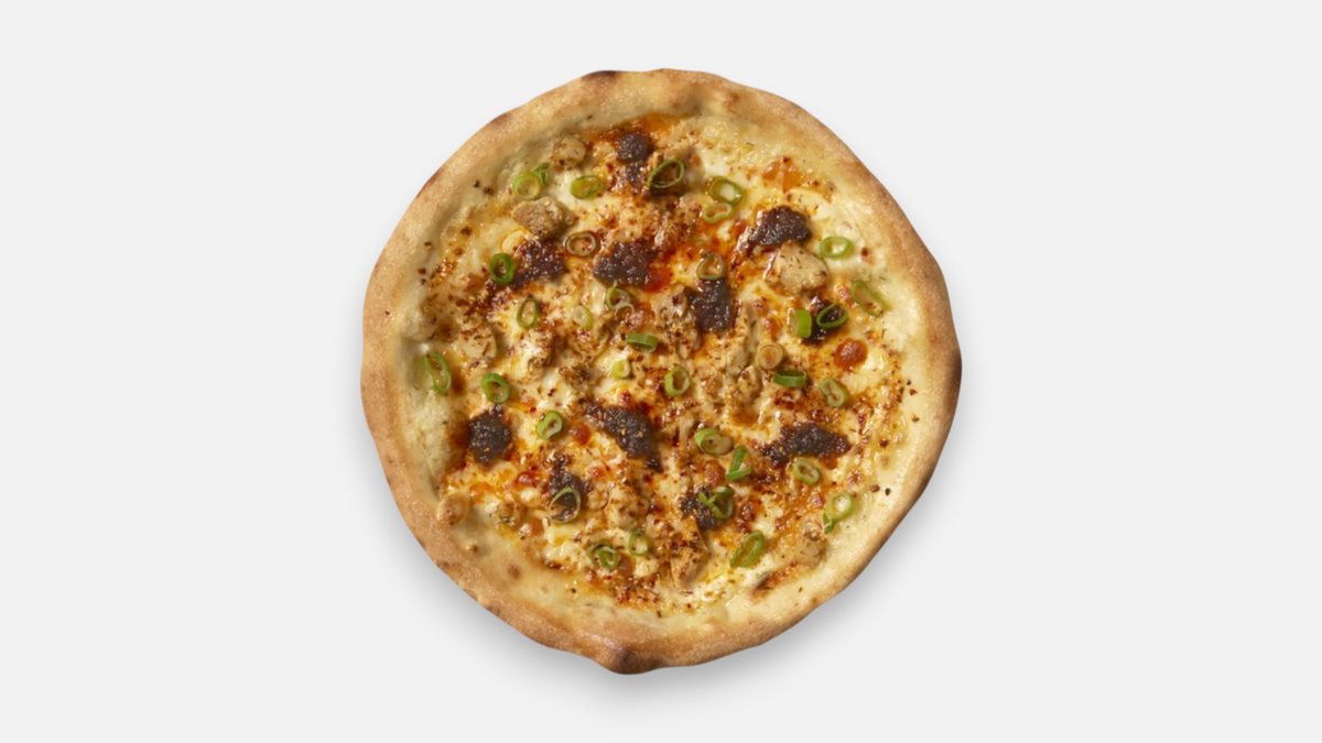 Hvit saus, mozzarella, nduja, urtekrydret kylling og chili & sesam-krydder, toppet med vårløk.