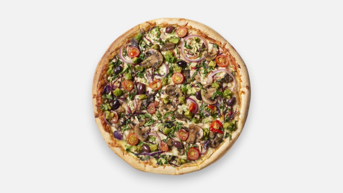 Avokado, rødløk, champignon, oliven, cherrytomat og grønnkål. Osten er byttet ut med en smaksrik vegansk aioli. Toppes med nykvernet pepper og limezest. Oliven kan inneholde olivensteiner