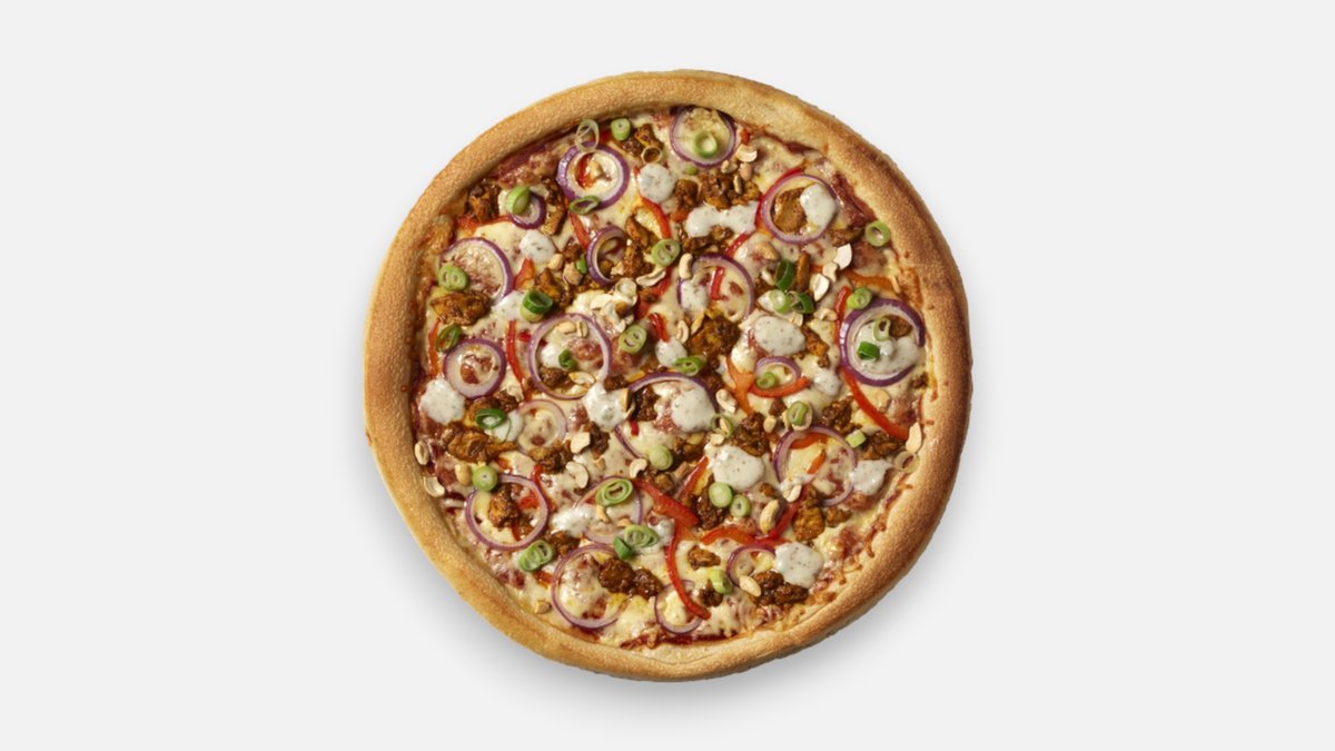 Satay-marinert kylling, paprika, rødløk, ananas, sataysaus og peanøtter. Toppes med fersk koriander og limezest.