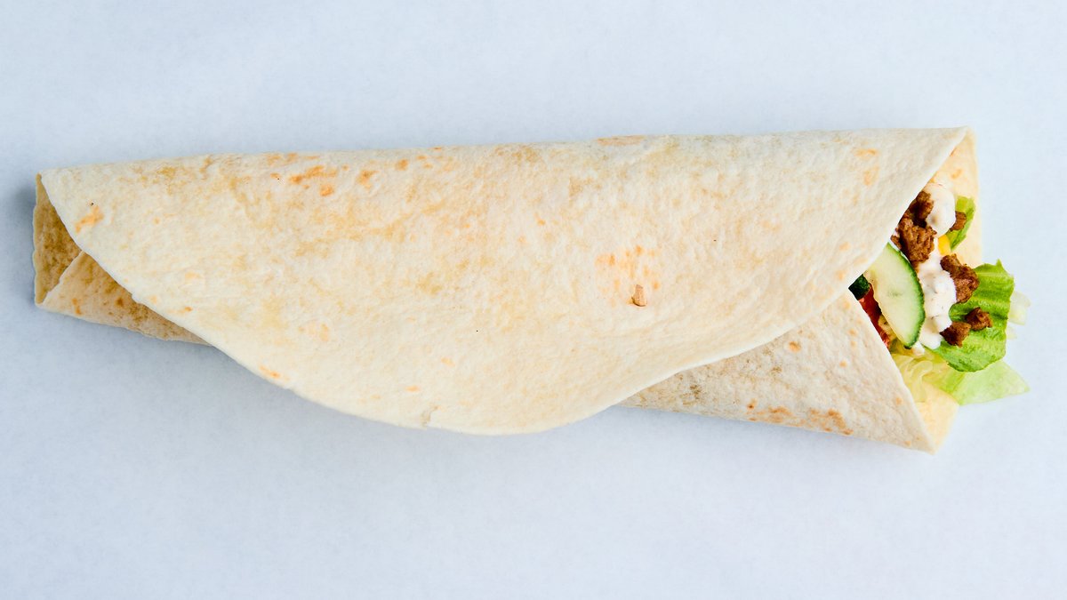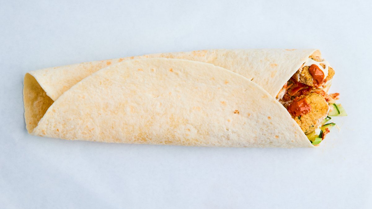 Falafel i rull med salat, agurk, tomat og saus. Velg mellom liten og stor.