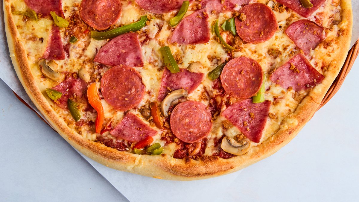 Pizza med pepperoni, skinke, løk, paprika og champignon.