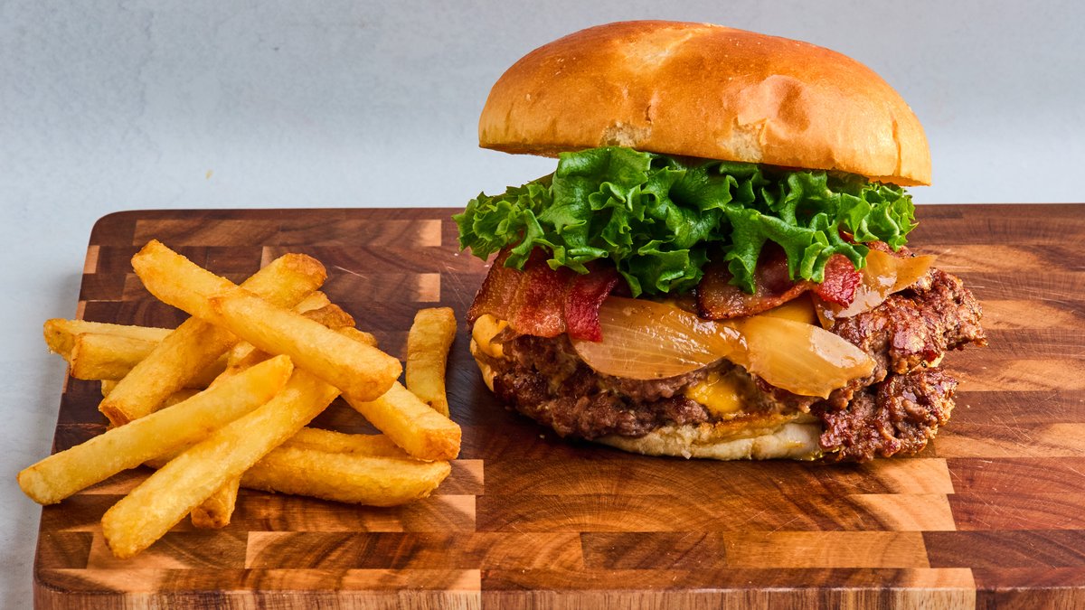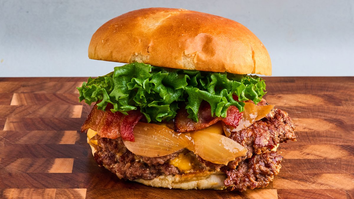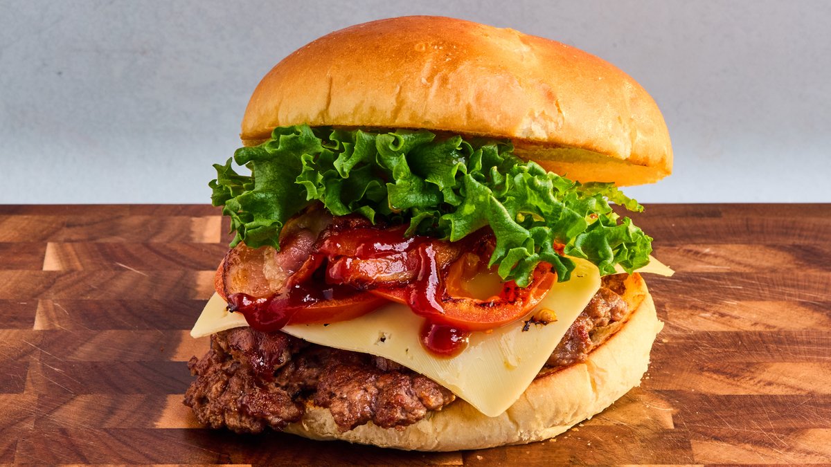 Burger med kjøtt, bacon, karamellisert løk, salat, ost og dressing
