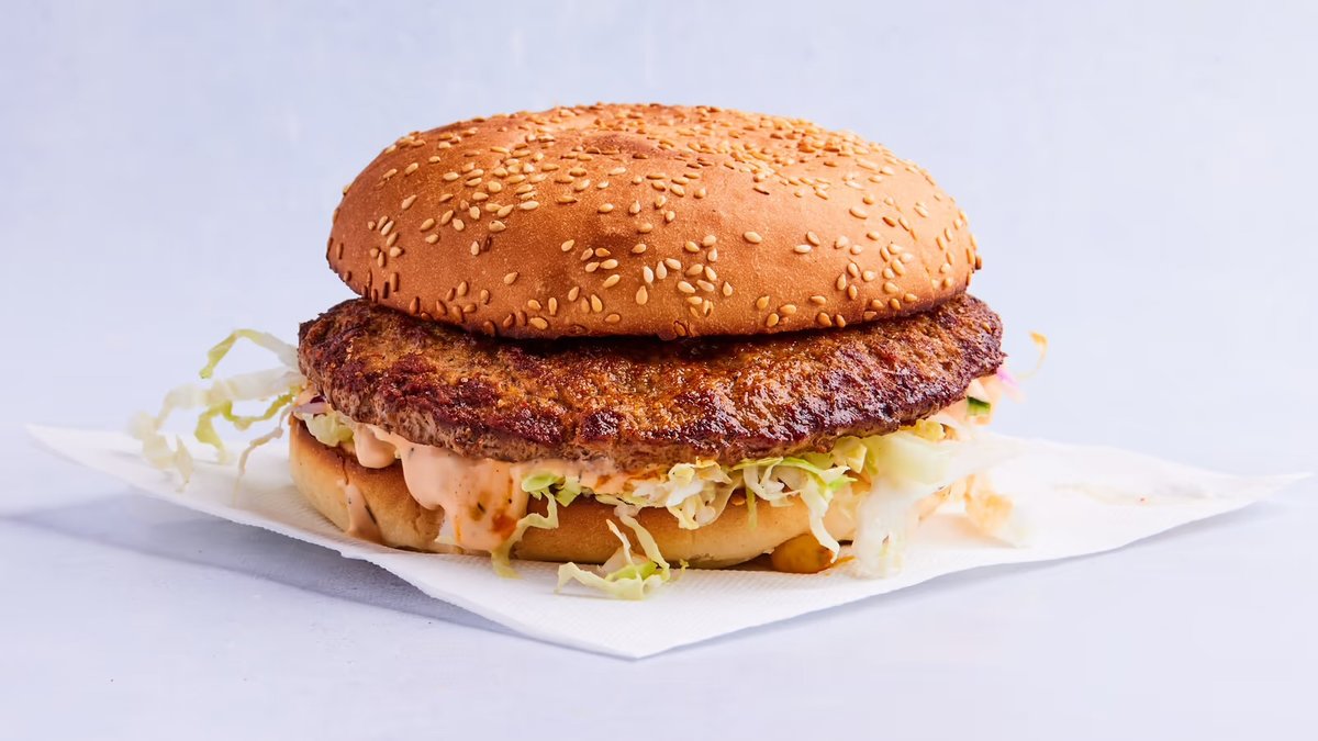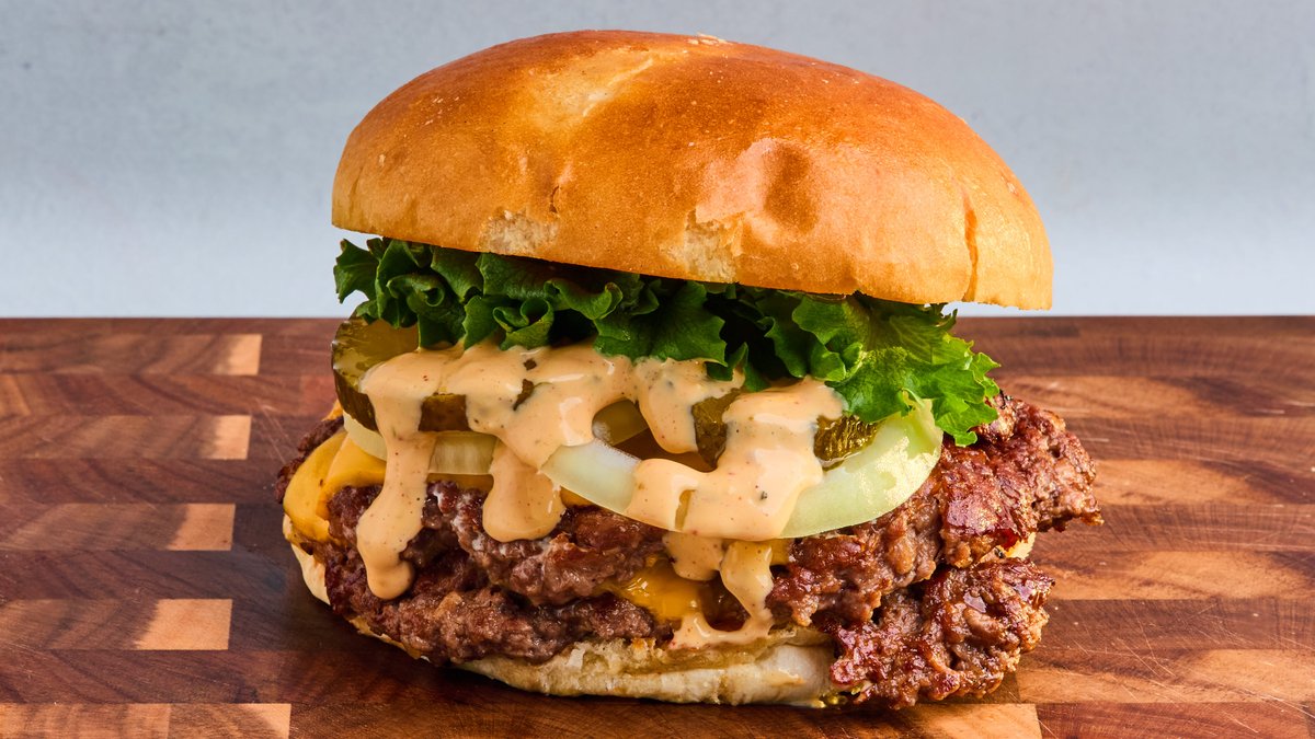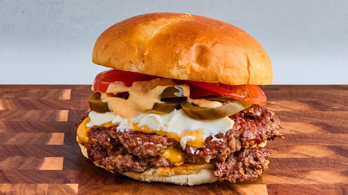 Burger med kjøtt dobbel ost, ketchup, sennep, løk og agurk.