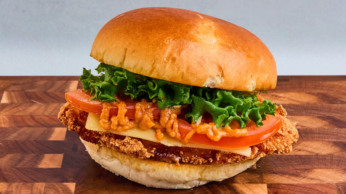 Burger med kyllingkjøtt, buffalo, saus, hvit ost, tomat og salat.
