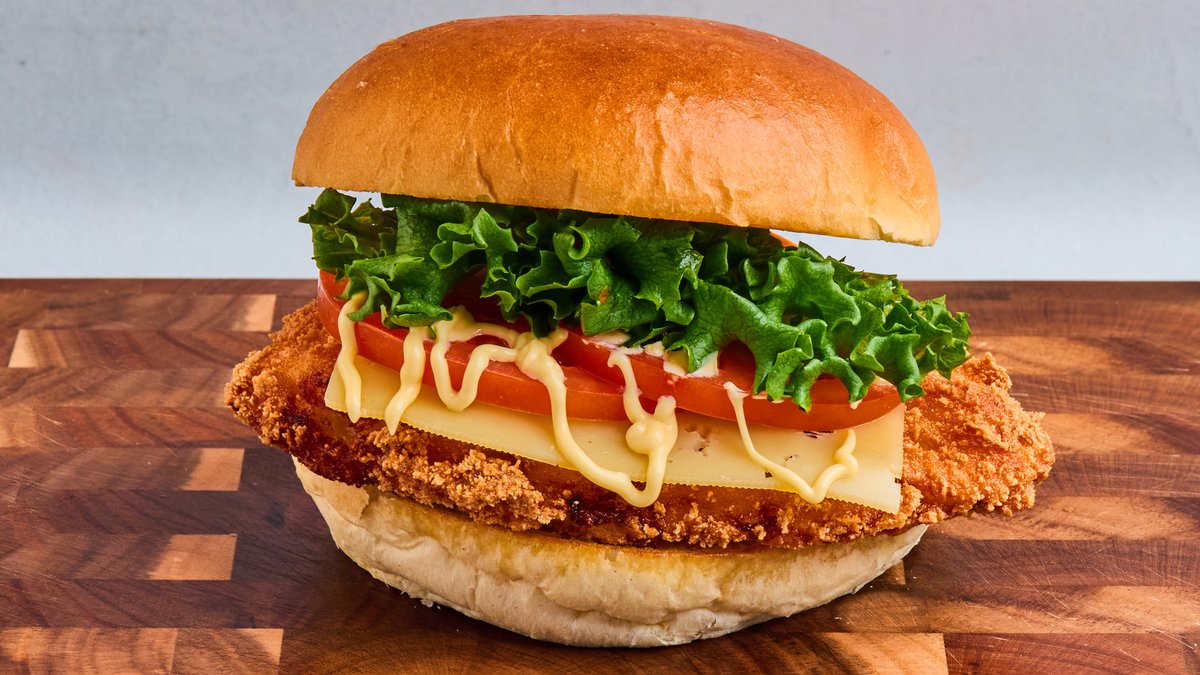Burger med kyllingkjøtt, hvit ost, majo, tomat og salat.