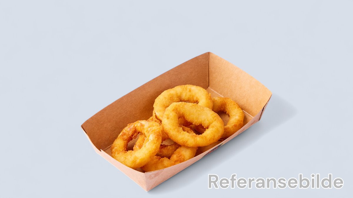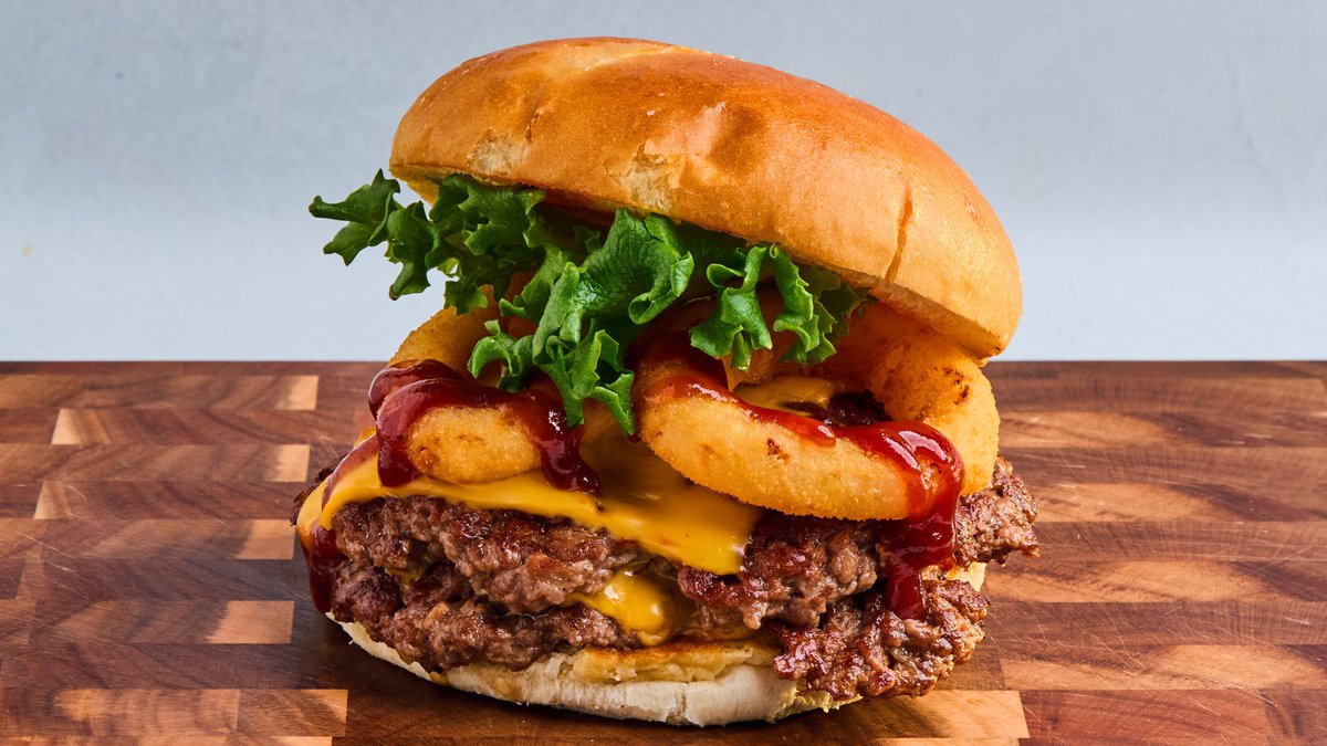 Burger med kjøtt, krispy salat, ost, løkringer og BBQ.