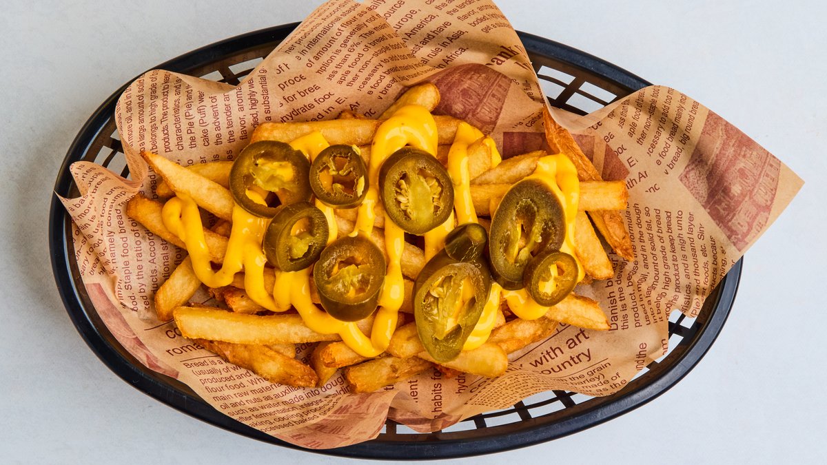 Serveres med pommes frites, smeltet ost og jalapenos.