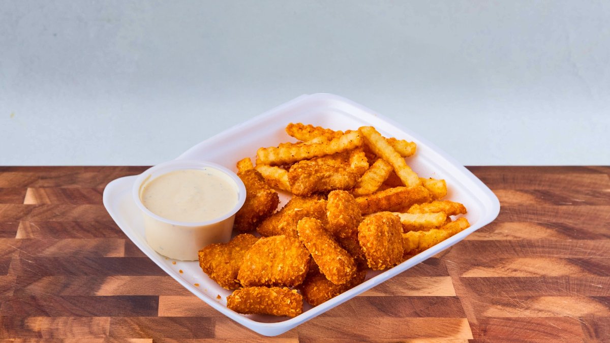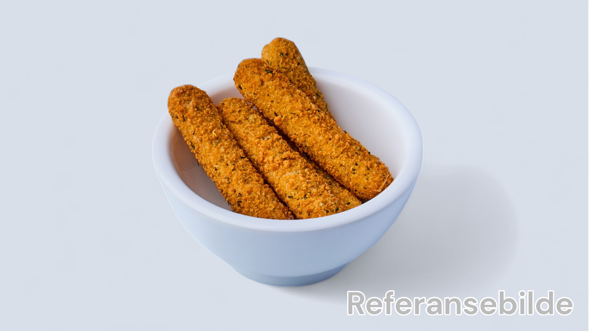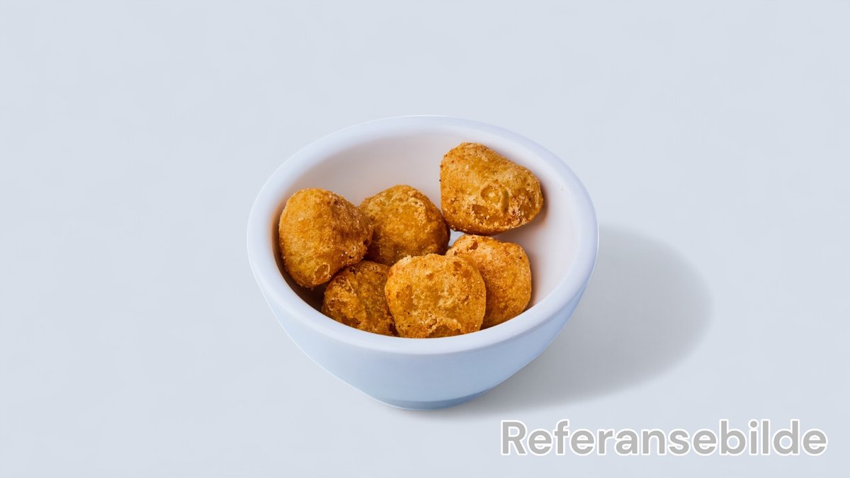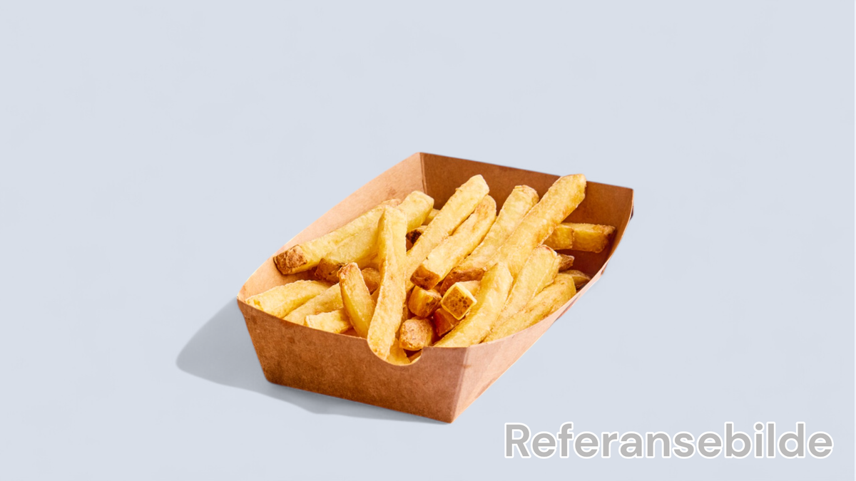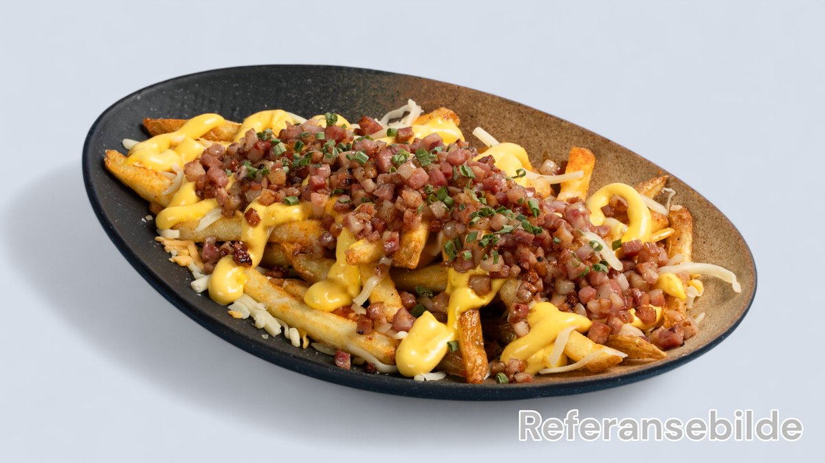 Serveres med pommes frites, bacon, smeltet ost og parmesan.