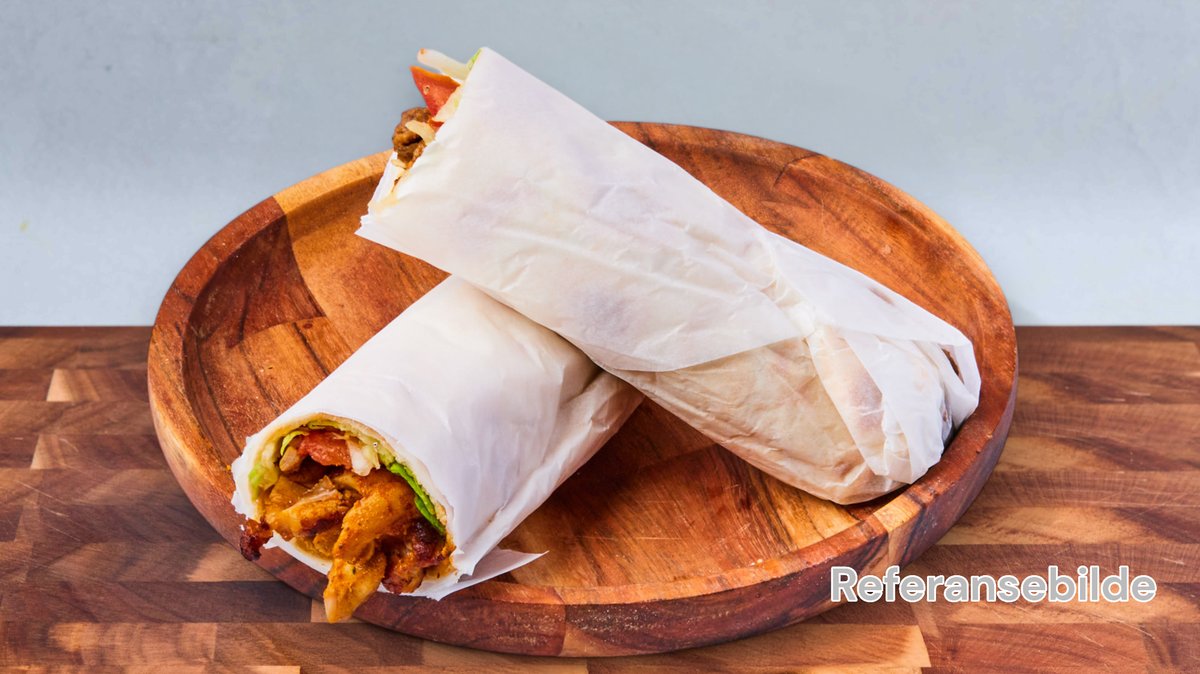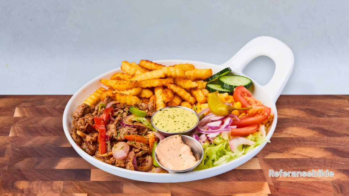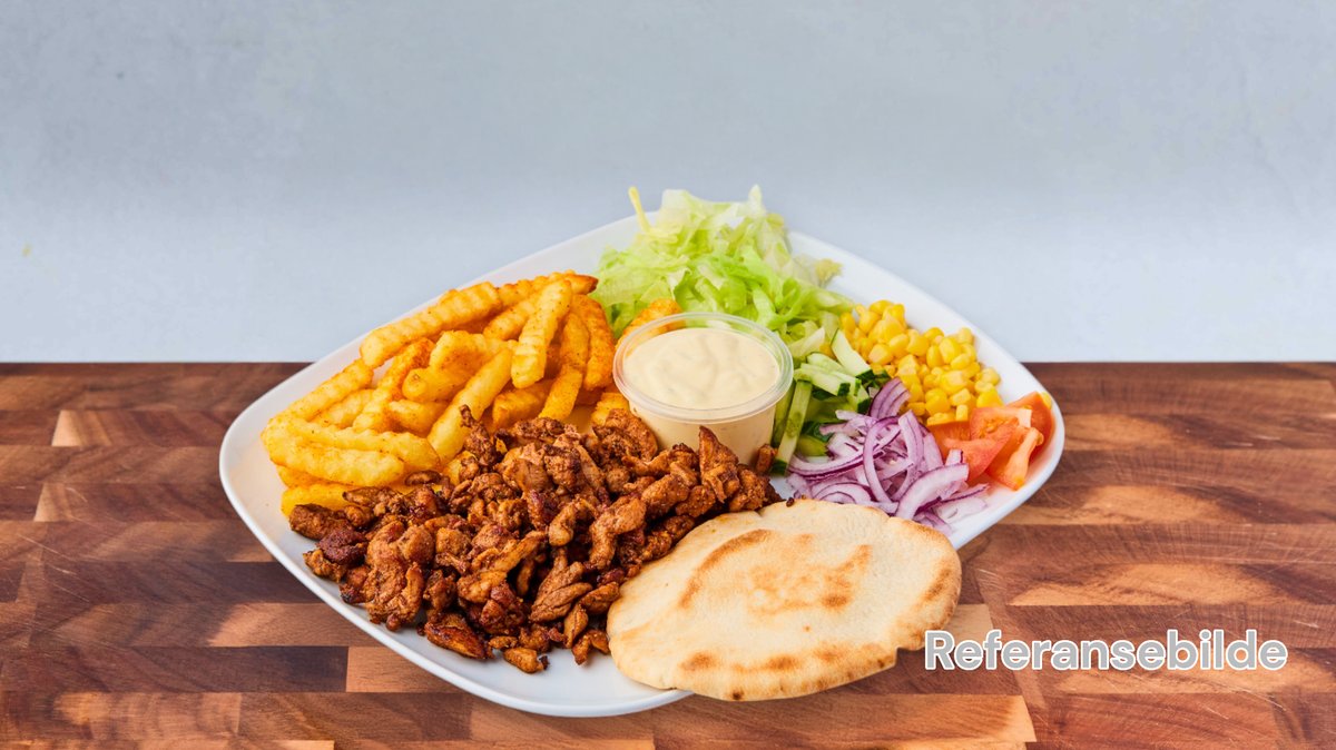 Serveres med grønnsaker, pommes frites og kebabsaus. Velg mellom Kebabkjøtt eller Kylling.