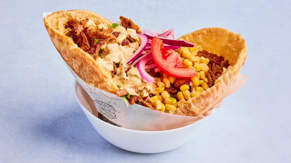 Serveres med salat, tomat, løk mais og kebabsaus. Velg mellom Kebabkjøtt eller Kylling.