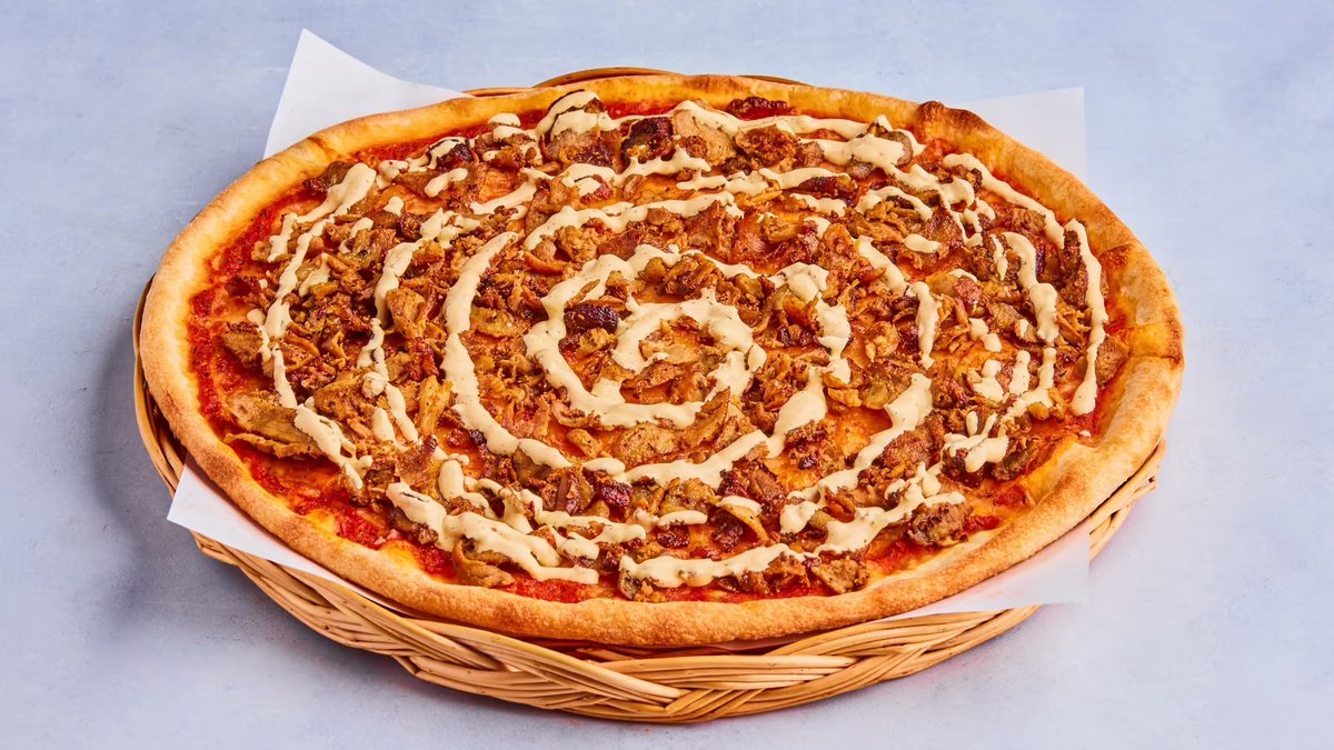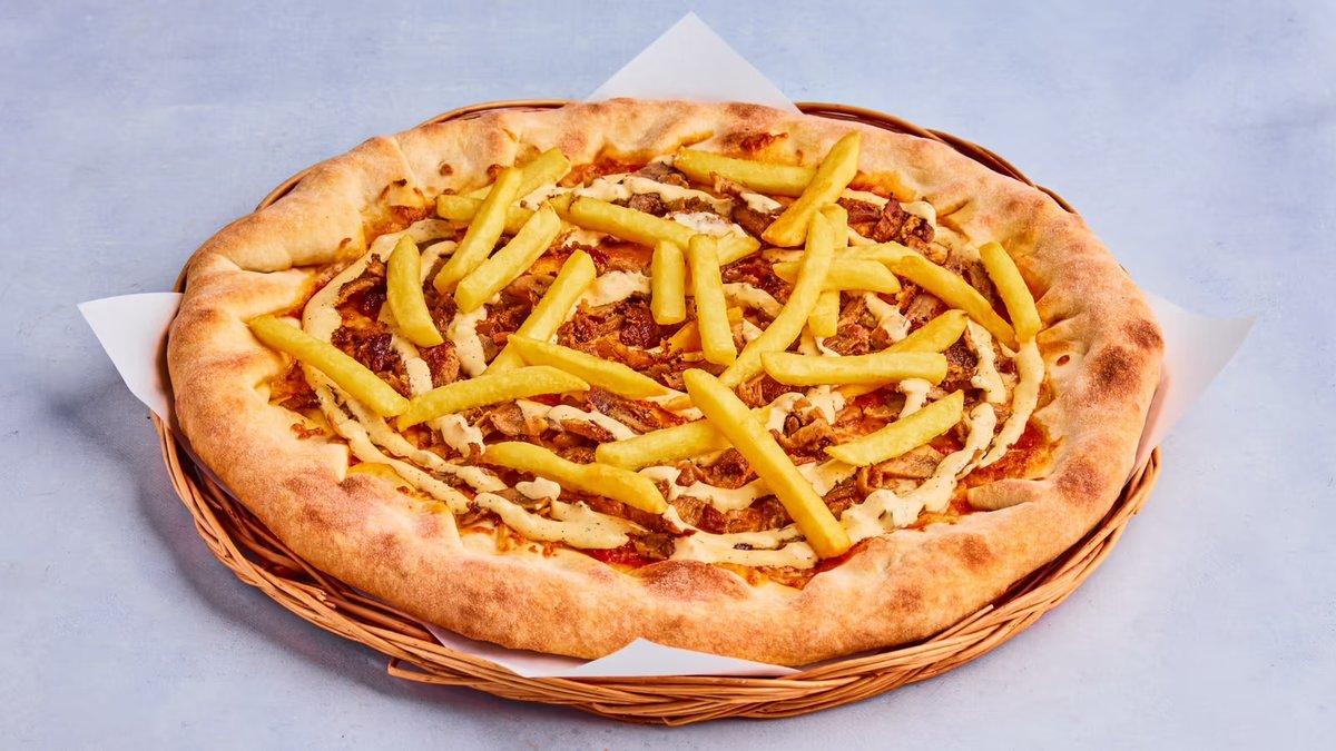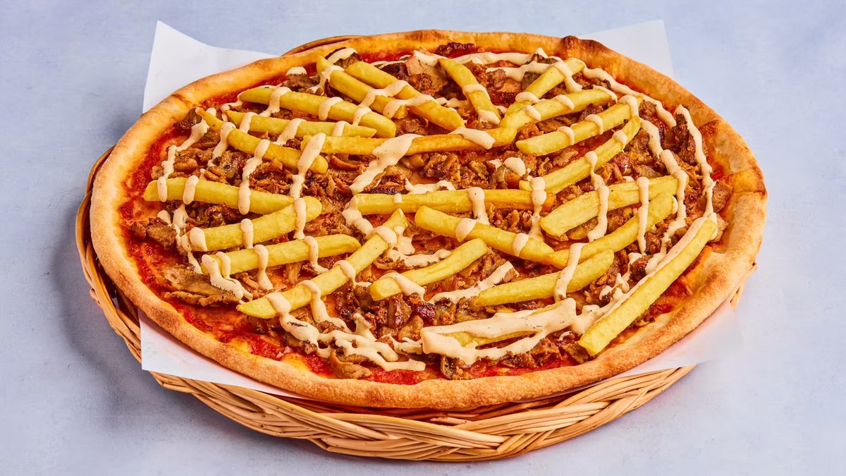 Tomatsaus, ost, skinke, bacon, gyroskjøtt, ost i kanten, kebabsaus