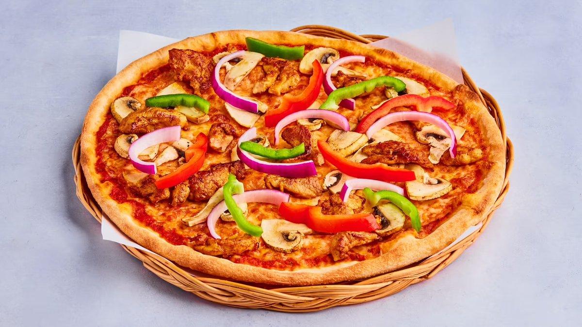 Tomatsaus, ost, løk,chapignon, paprika, kylling
