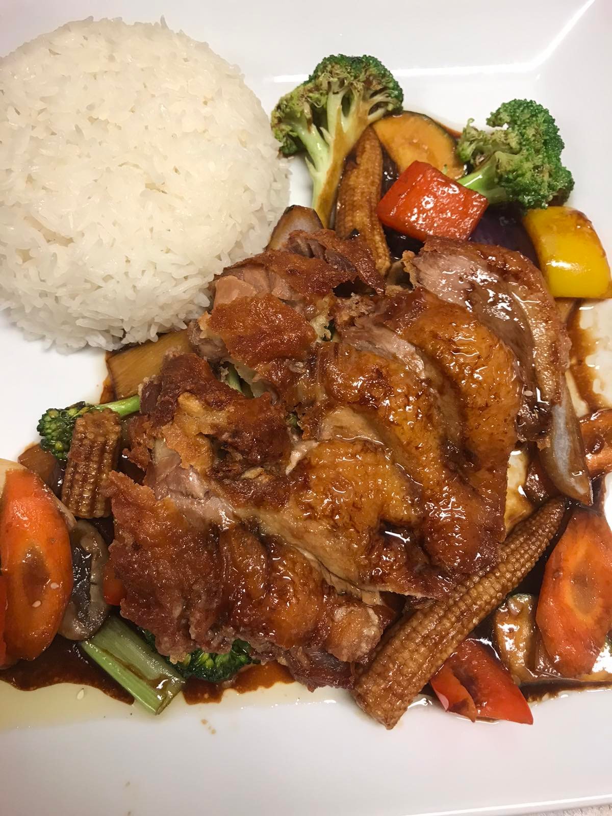 And med husets hoisinsaus med grønnsaker. Serveres med ris.