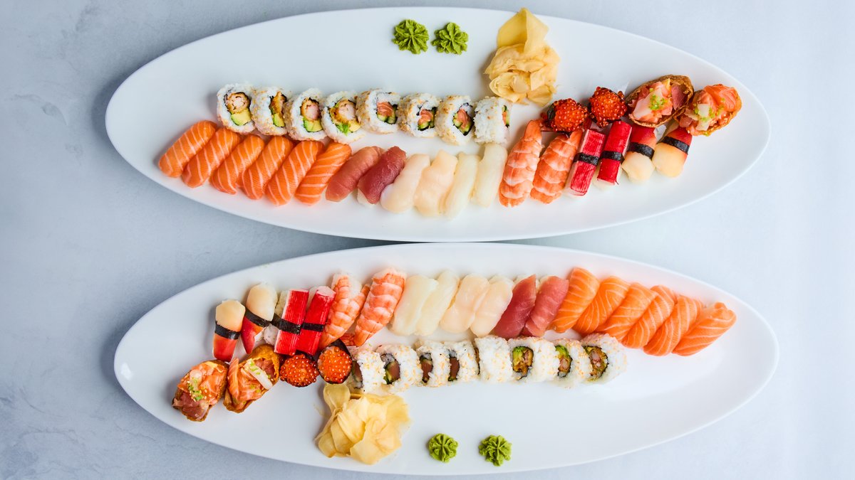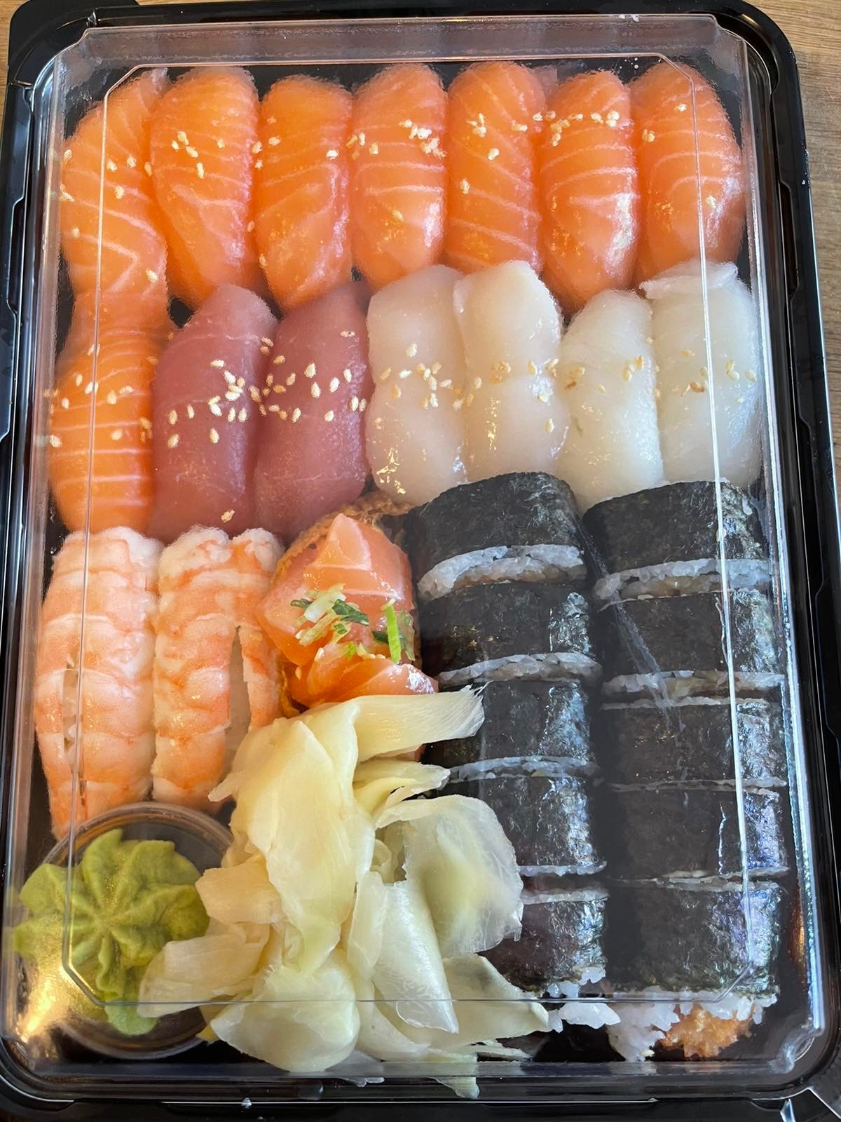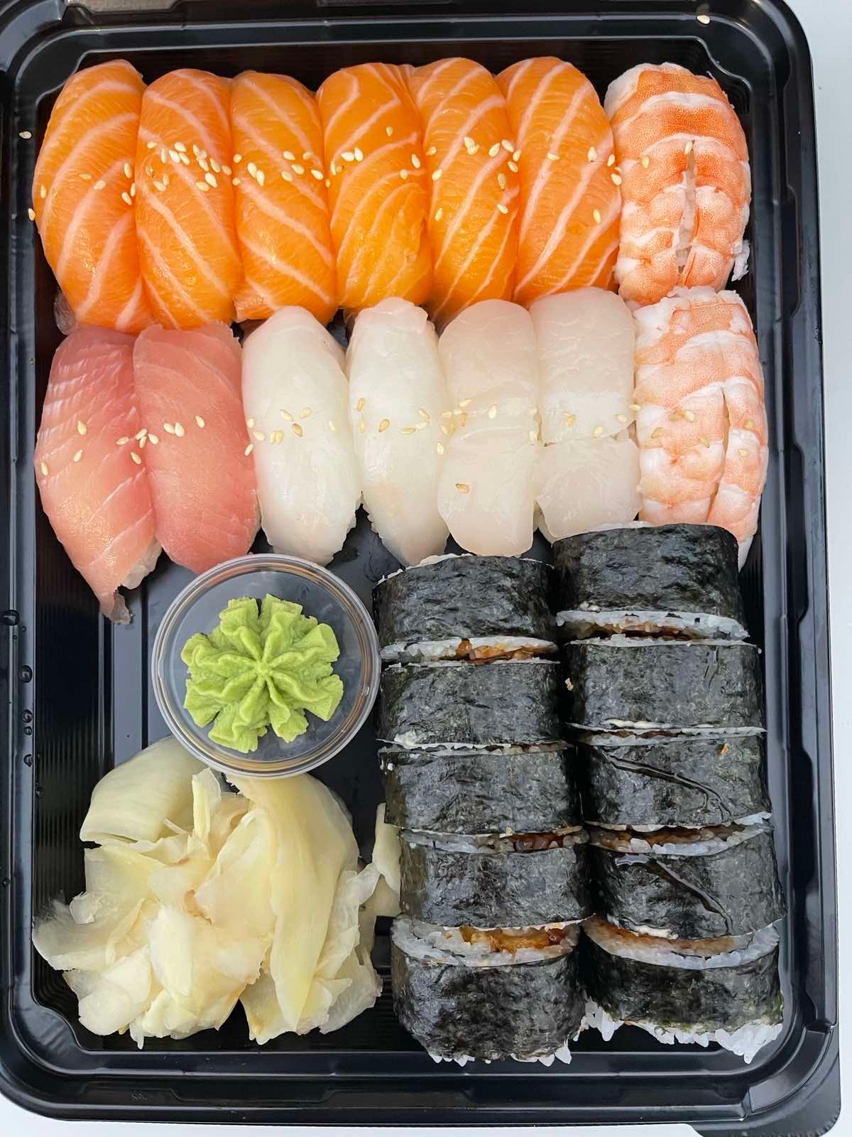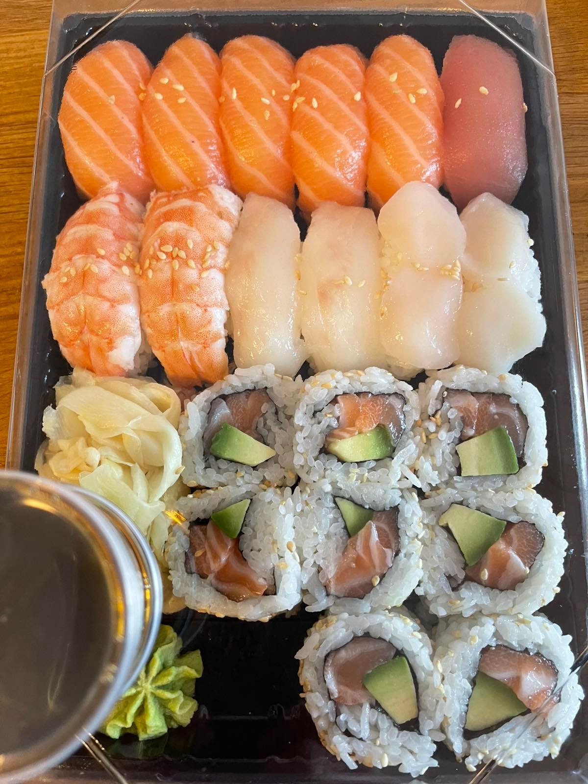 10 laks nigiri, 2 kveite nigiri, 2 tunfisk nigiri, 2 scampi nigiri, 2 kamskjell nigiri og 2 rødskjell nigiri.