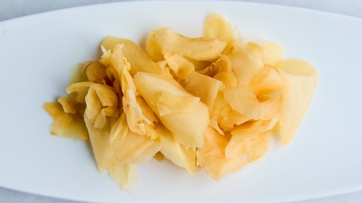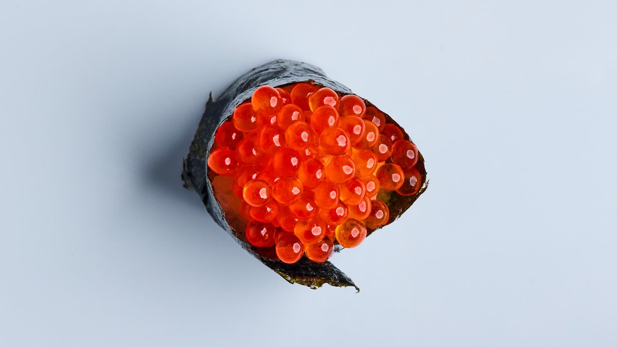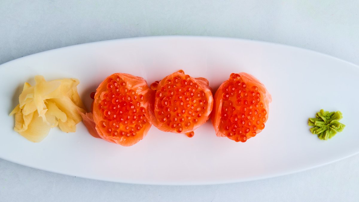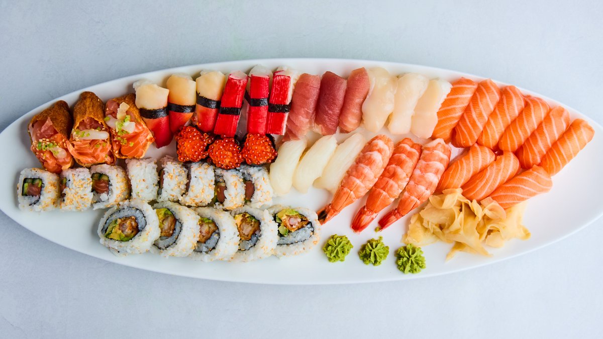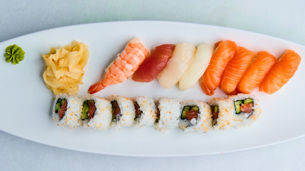 10 laks nigiri, 2 kveite nigiri, 2 tunfisk nigiri, 2 scampi nigiri, 2 kamskjell nigiri og 2 rødskjell nigiri.