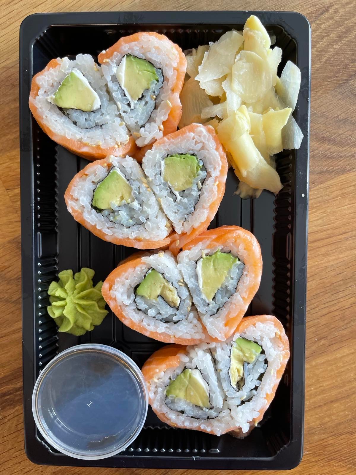 8 biter maki med laks, mango, kremost og sesamfrø.
