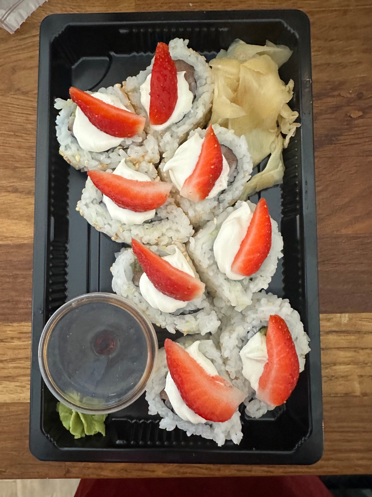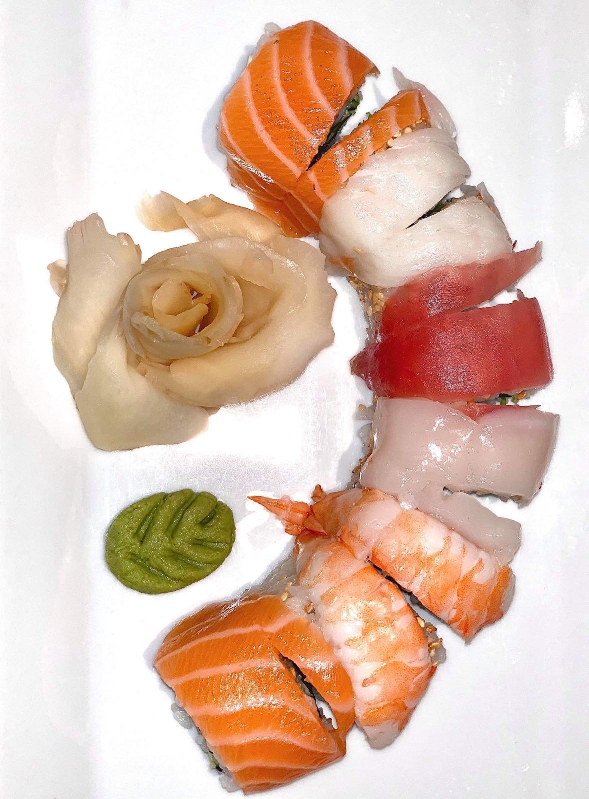 12 nigiri biter med 5 laks, 2 kveite, 1 tunfisk, 2 scampi, 2 kamskjell, 8 biter sakura maki (nr. 11) og sesamfrø.