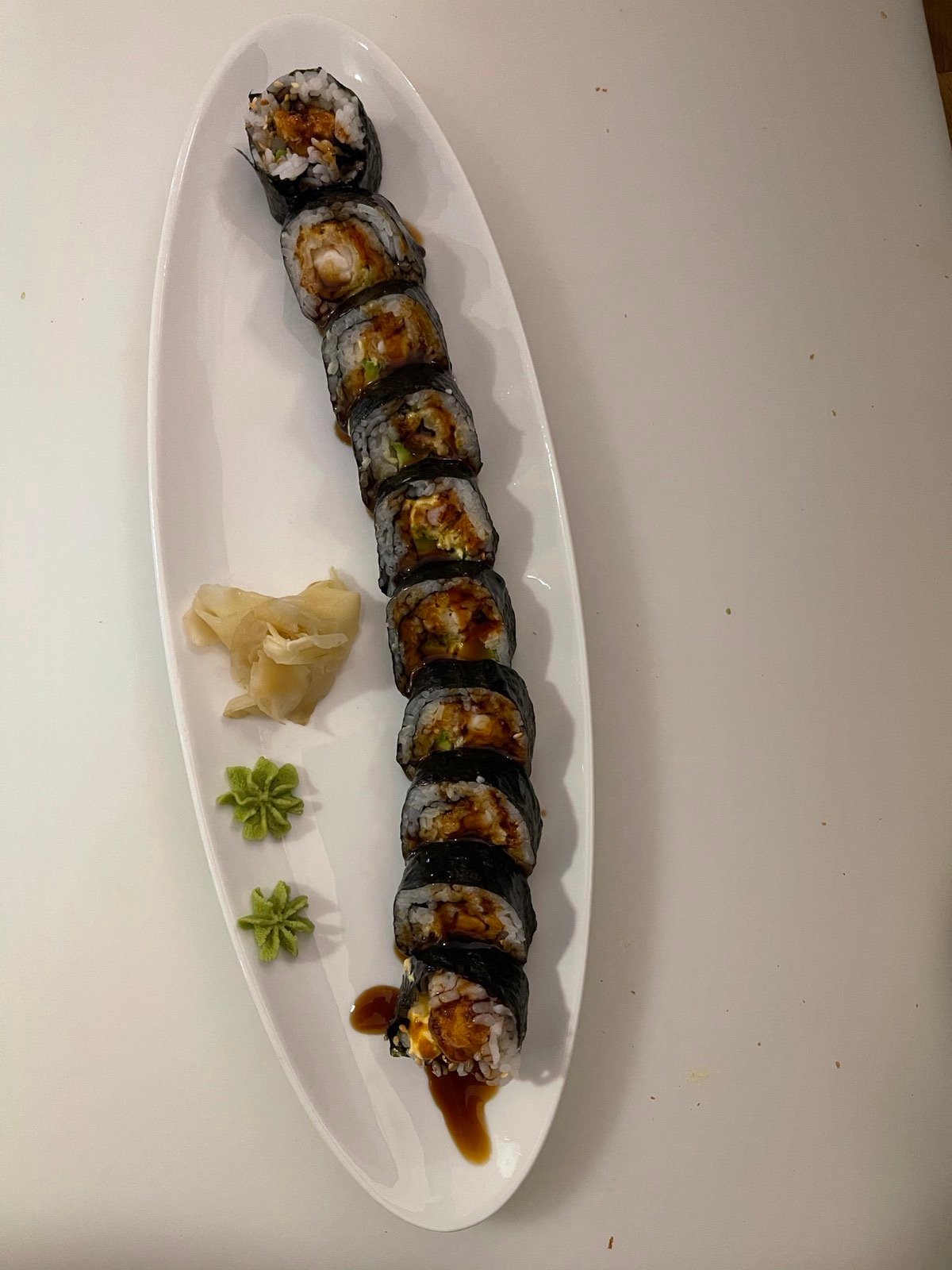 8 biter maki med tempura fritert champignon, teriyakisaus og sesamfrø.