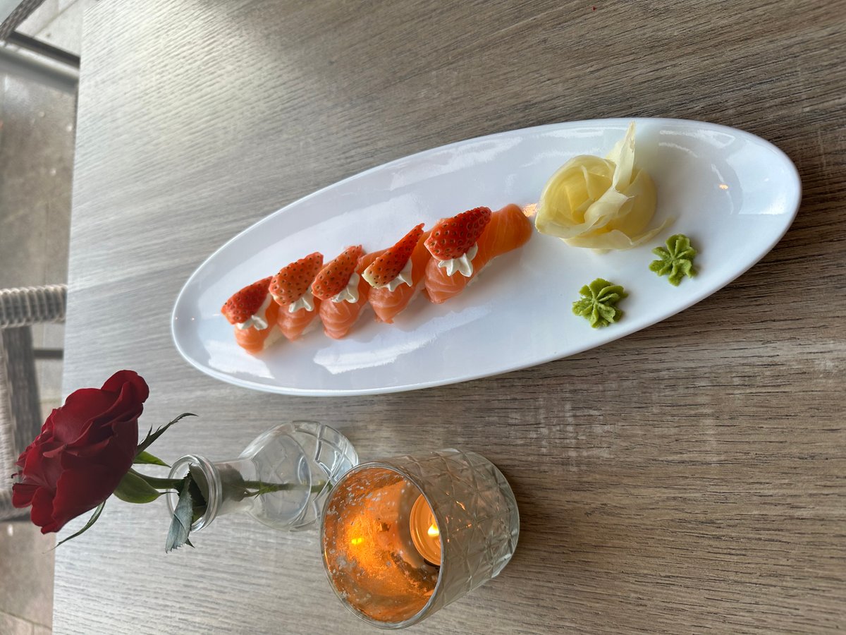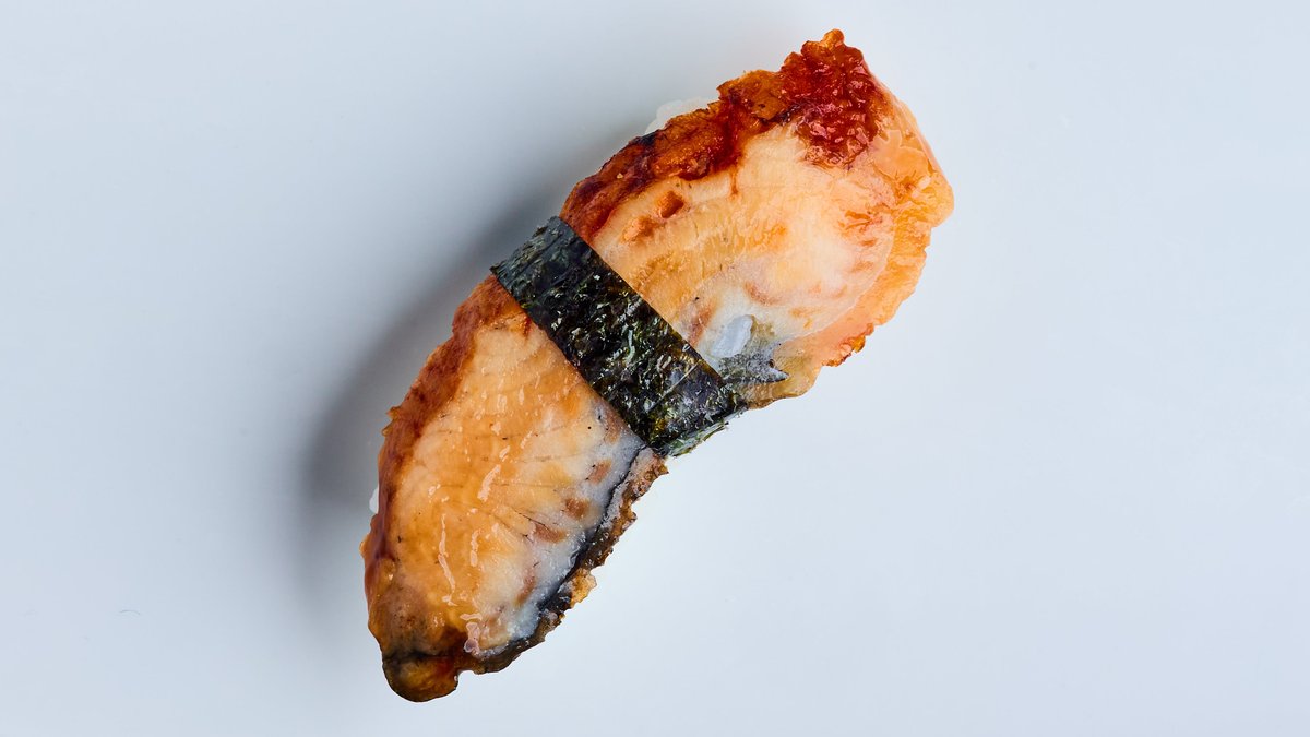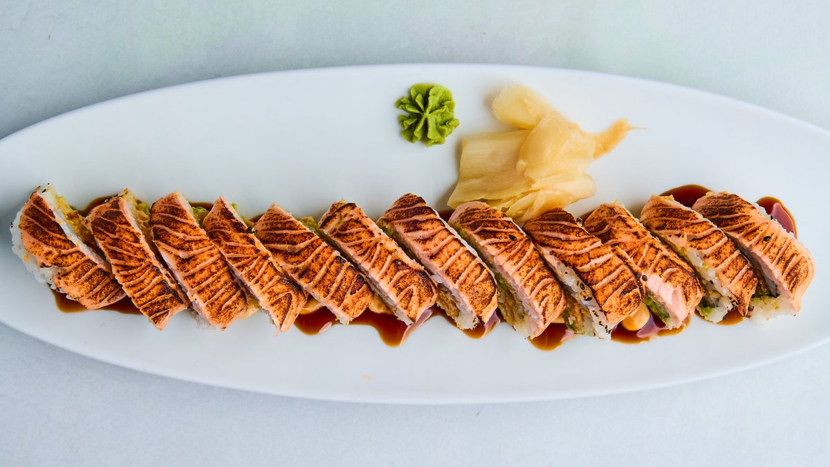 12 store biter med tempura scampi, purre, teriyakisaus, chili-majones, avokado og sesamfrø. Toppes med flambert laks.