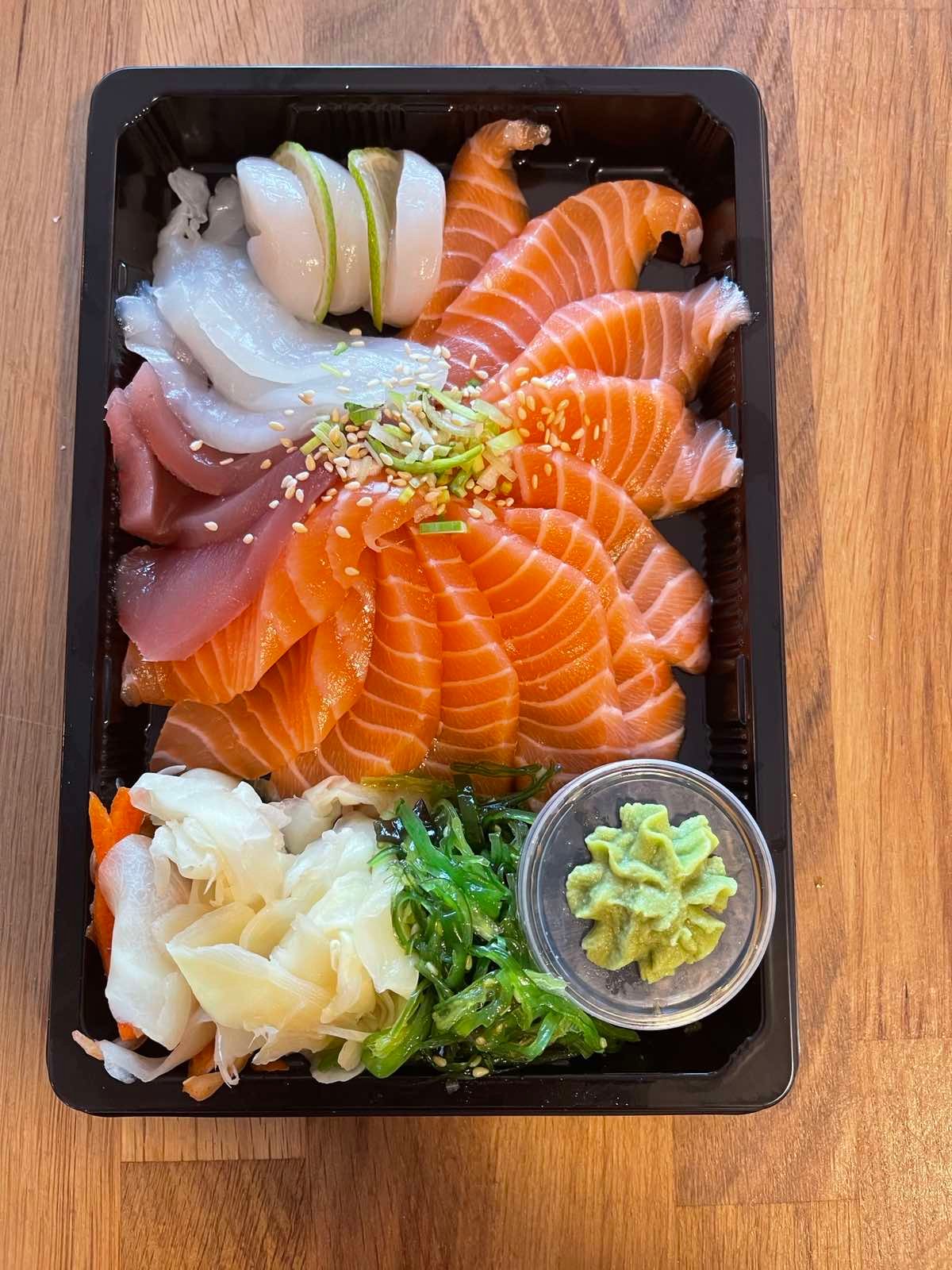 19 nigri biter med 8,laks, 2 kveite, 2 tunfisk, 2 scampi, 3 kamskjell, 2inari, 5 sashimi, 8 biter sake maki (nr. 13) og sesamfrø.