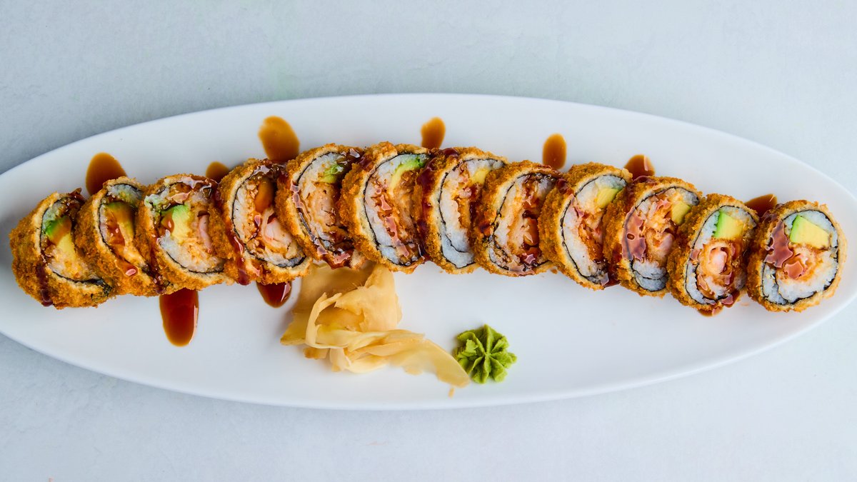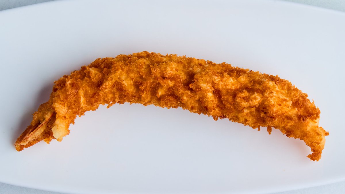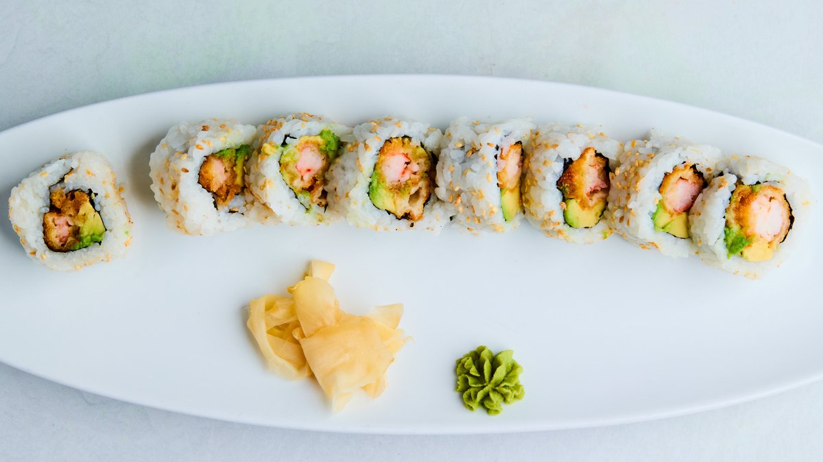 8 biter maki med fritert scampi, avokado og sesamfrø.