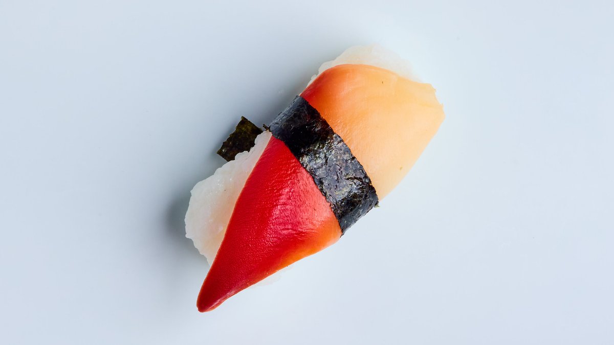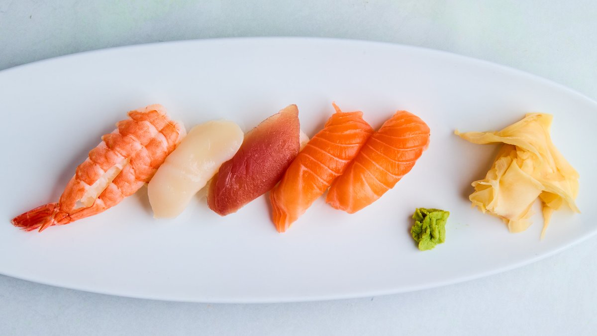 8 laks nigiri, 2 kveite nigiri, 2 tunfisk nigiri, 2 scampi nigiri, 2 kamskjell nigiri og 2 rødskjell nigiri.