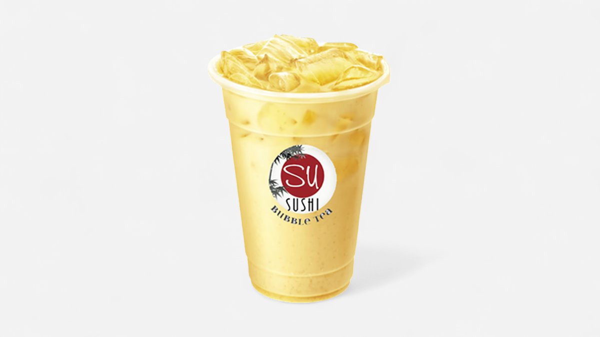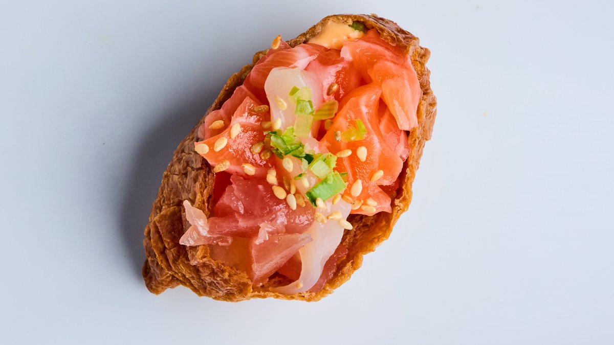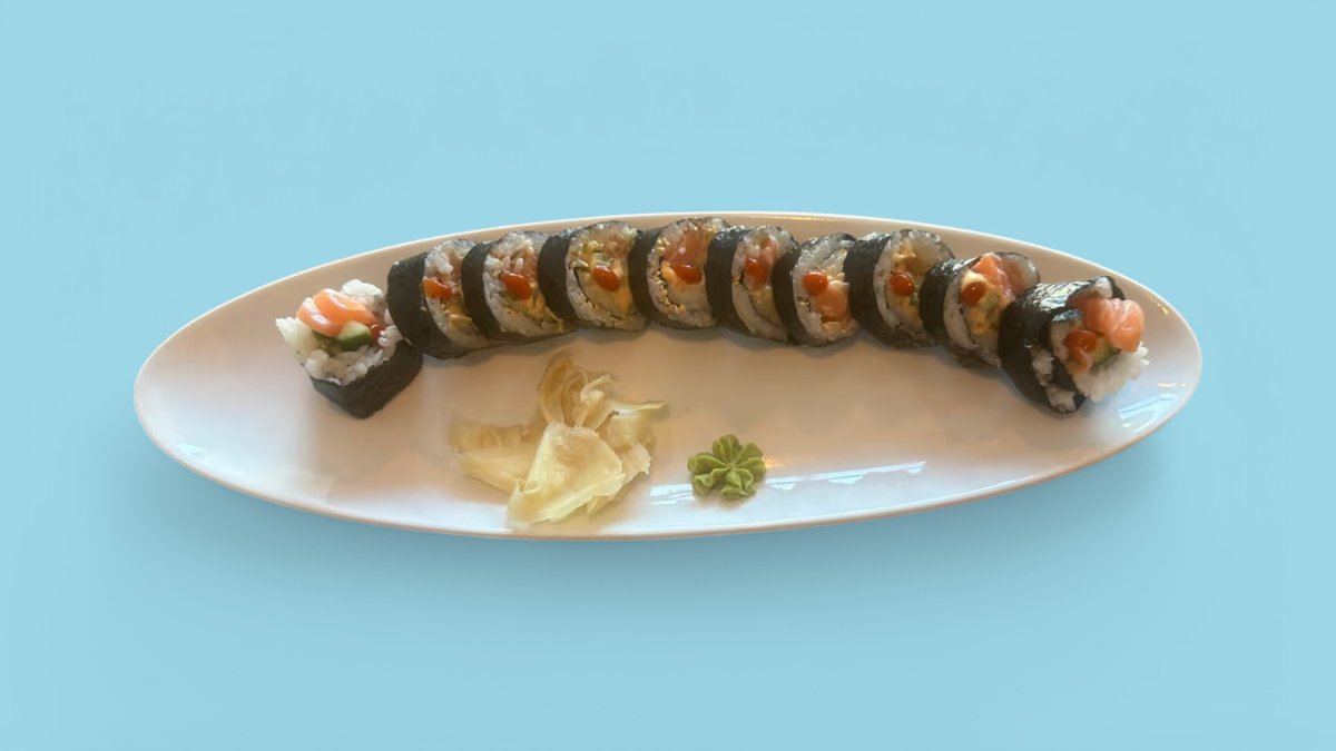 12 store biter med tempura scampi, purre, teriyakisaus, chili-majones, avokado og sesamfrø. Toppes med laks.