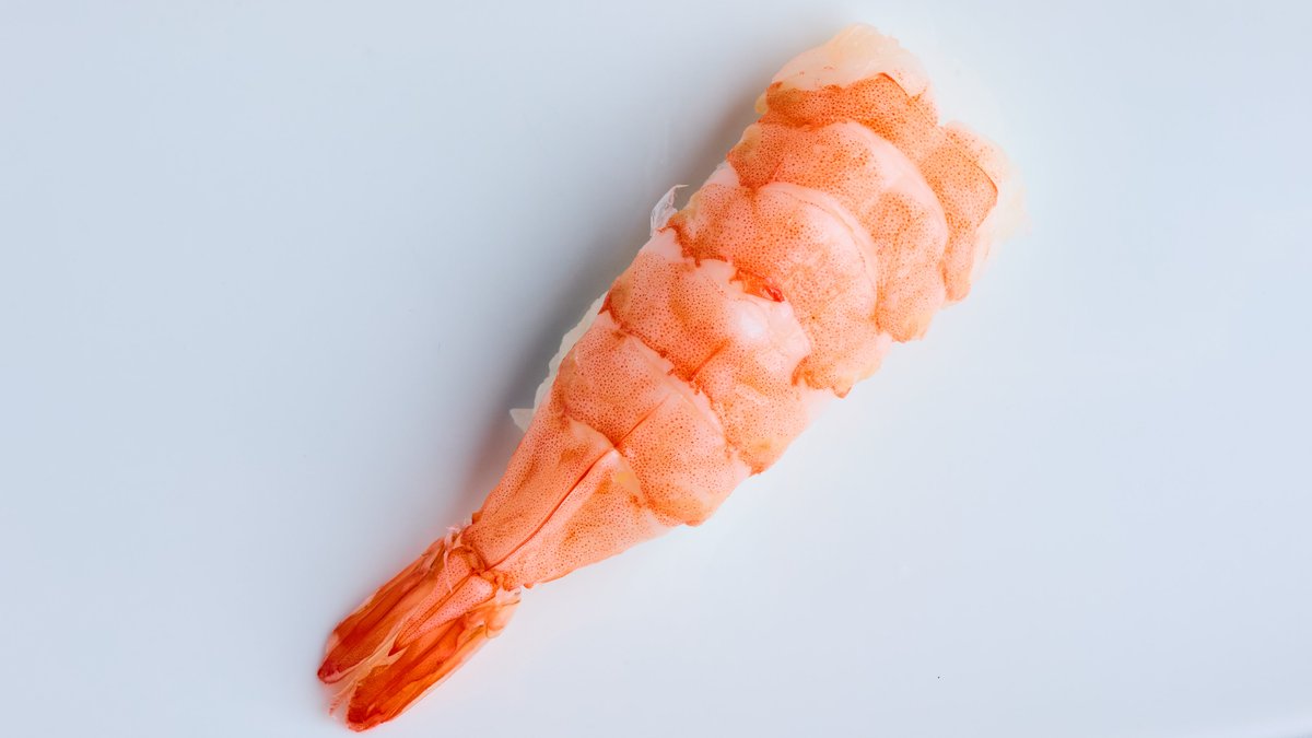 8 biter maki med kokt scampi, avokado og sesamfrø.